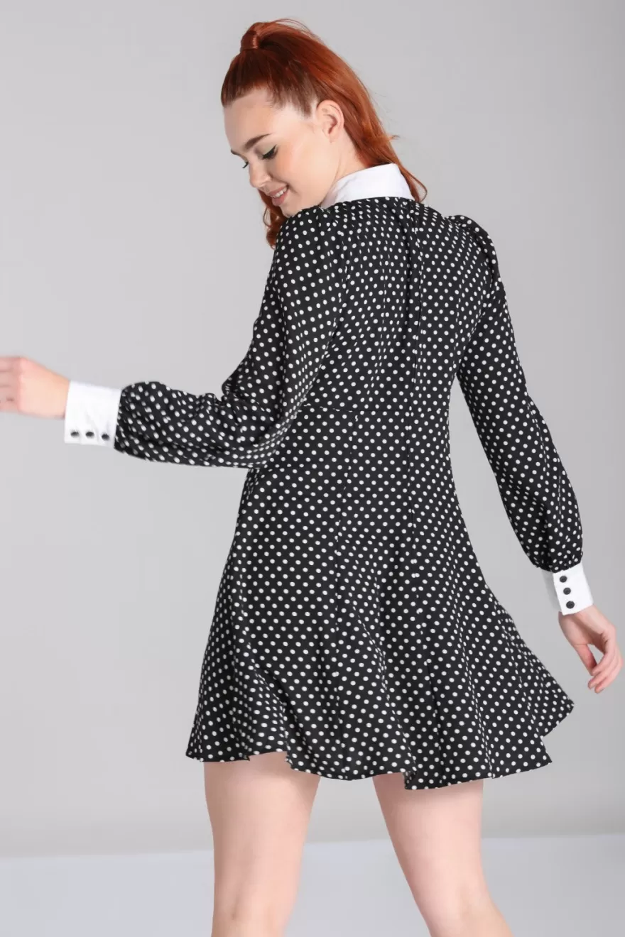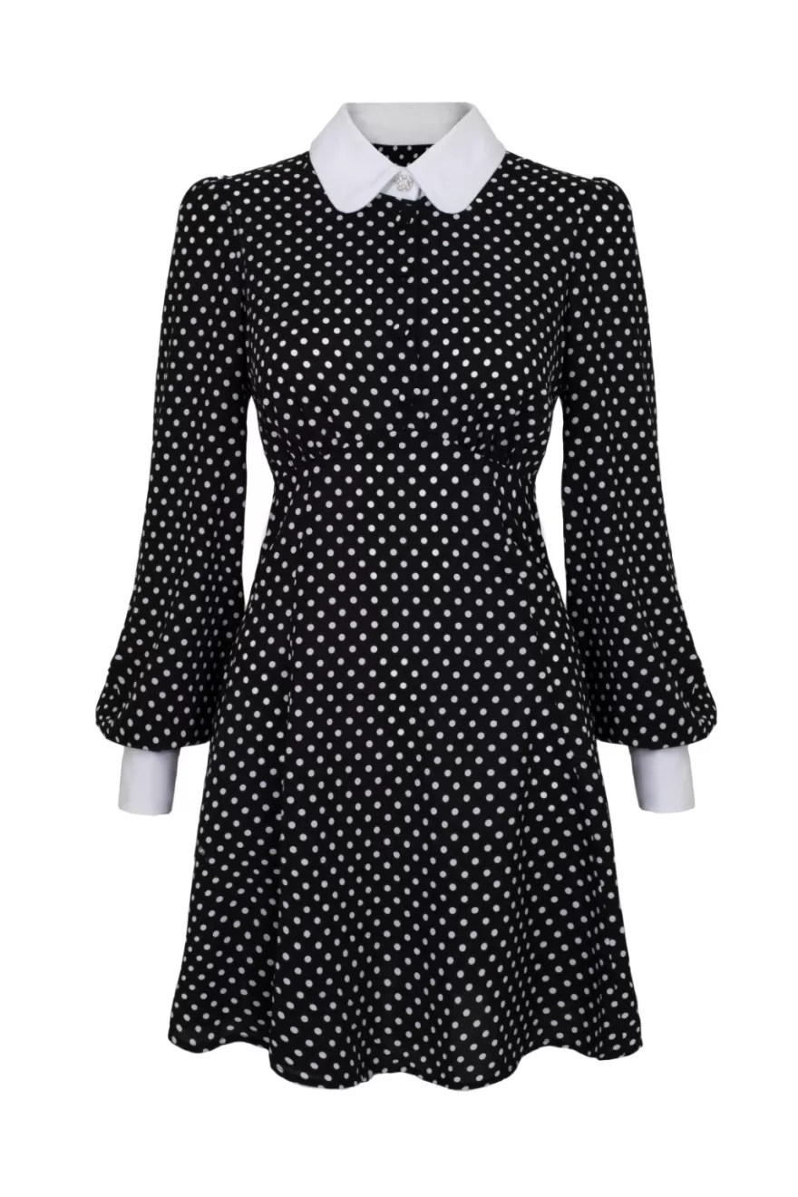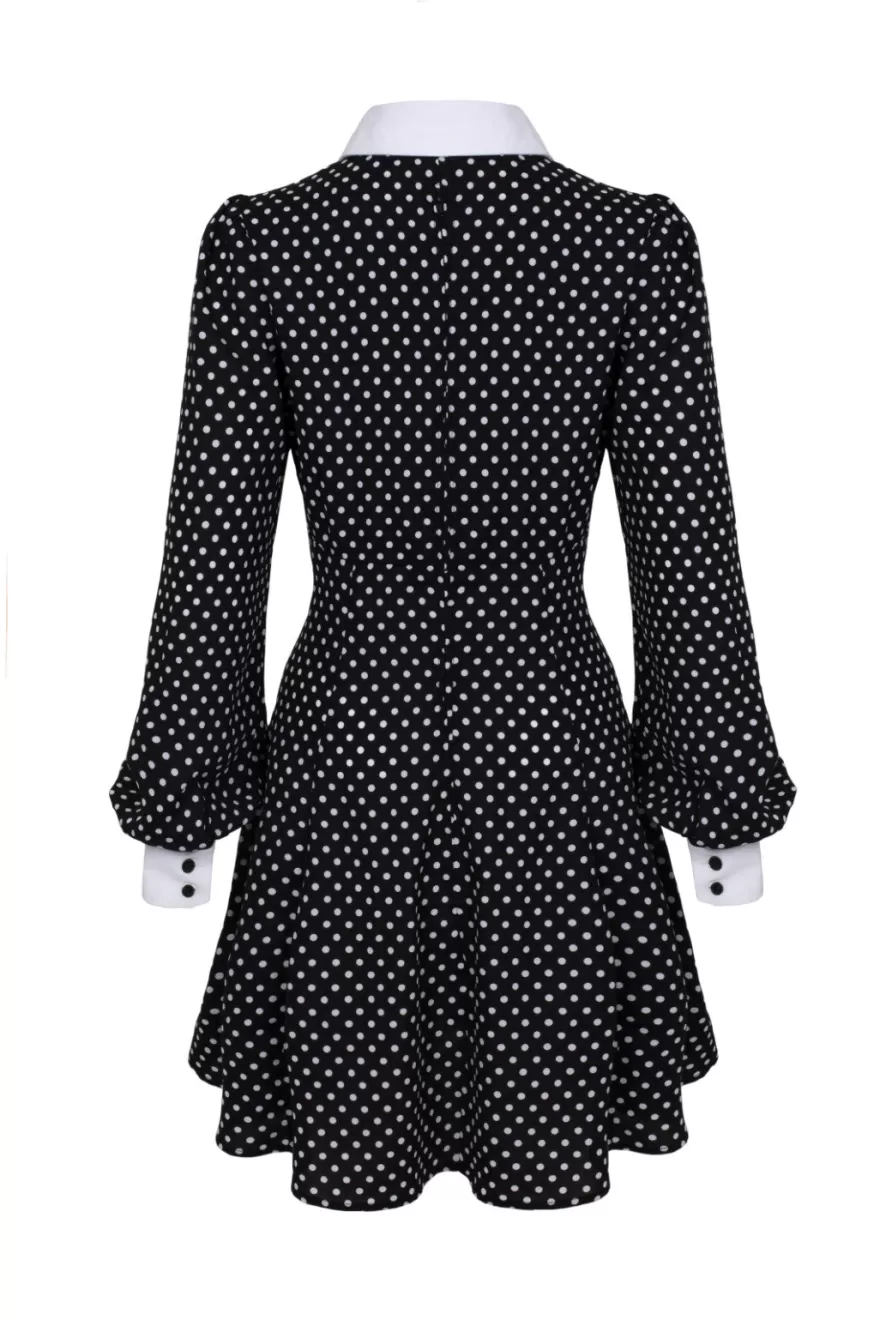 Retro viscose mini dressMain fabric is black with white polka dotsUnder bust seams with gatheringContrasting white point…