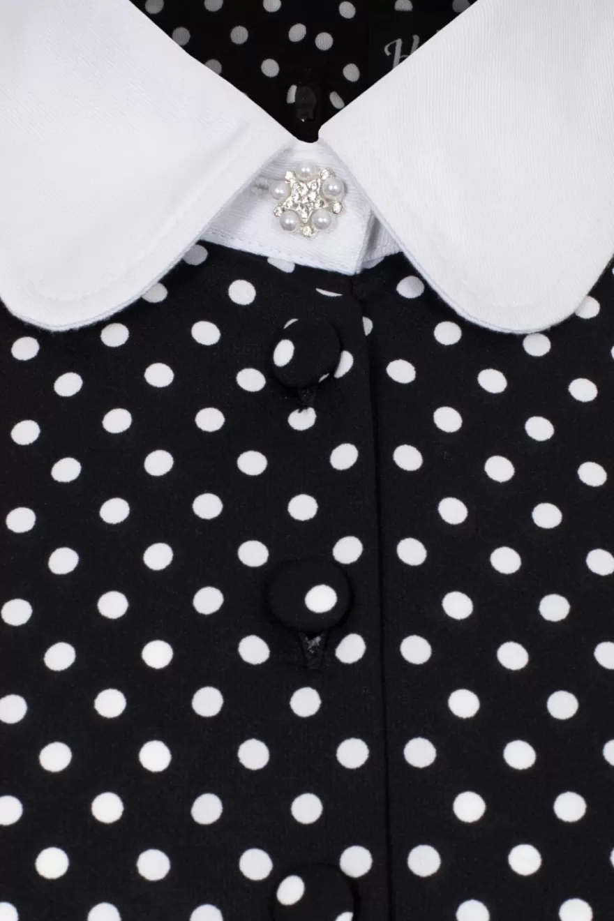 - Main fabric is black with white polka dots