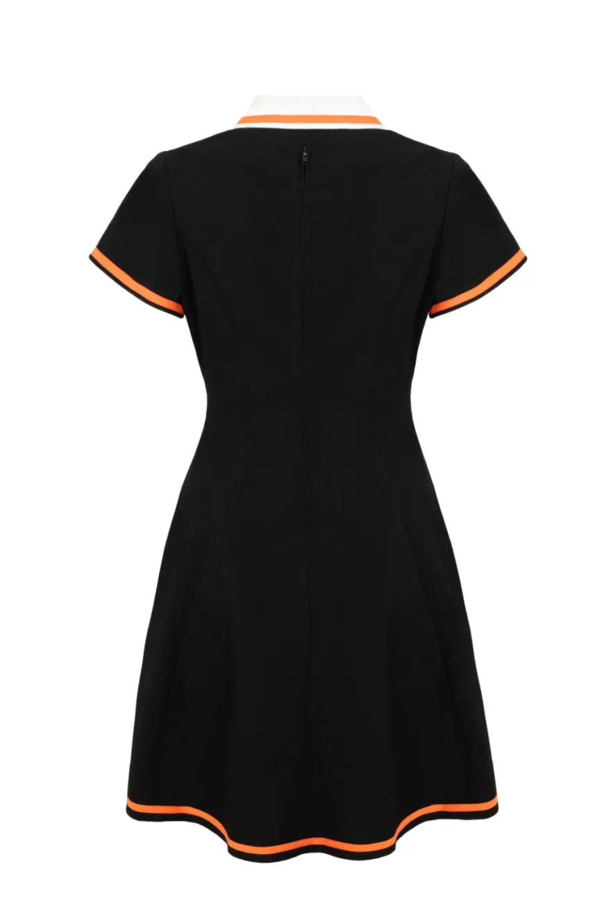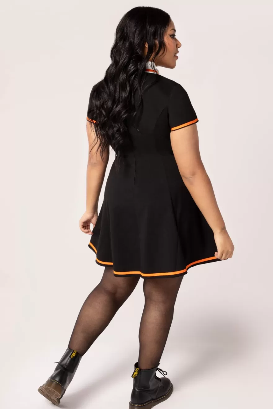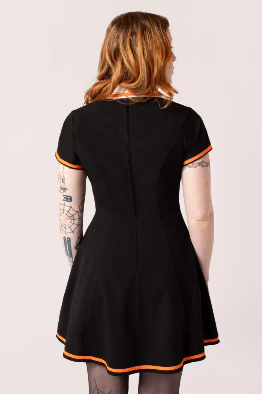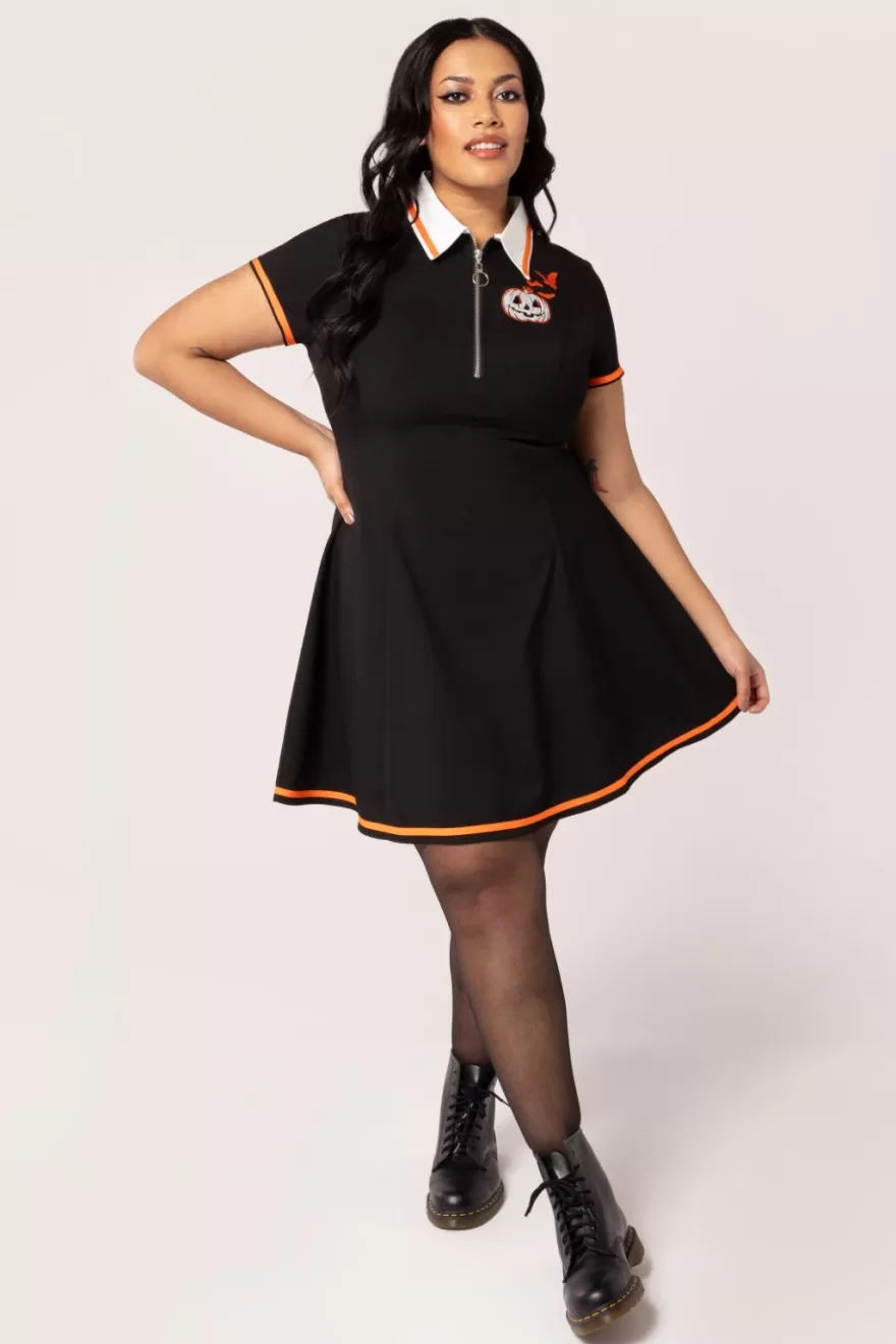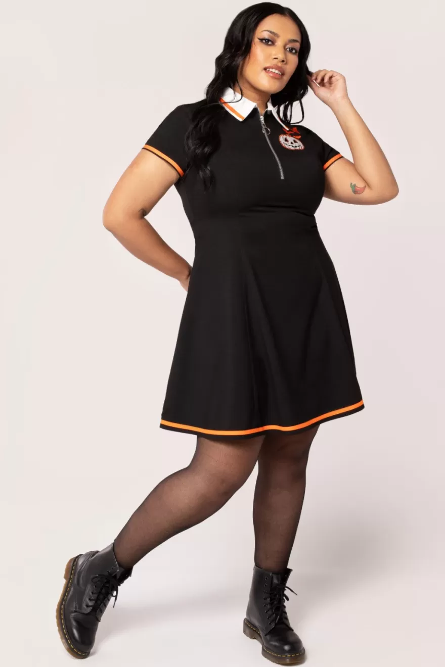 Black mini dressWhite pointed stand up collarJack o lantern embroidery on chest Exposed chunky zip down centre front of …
