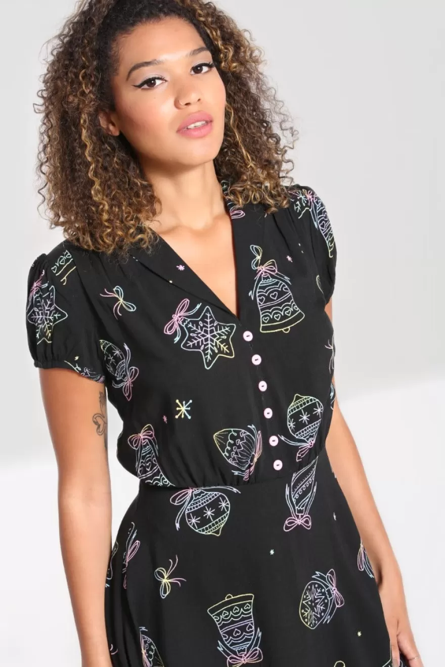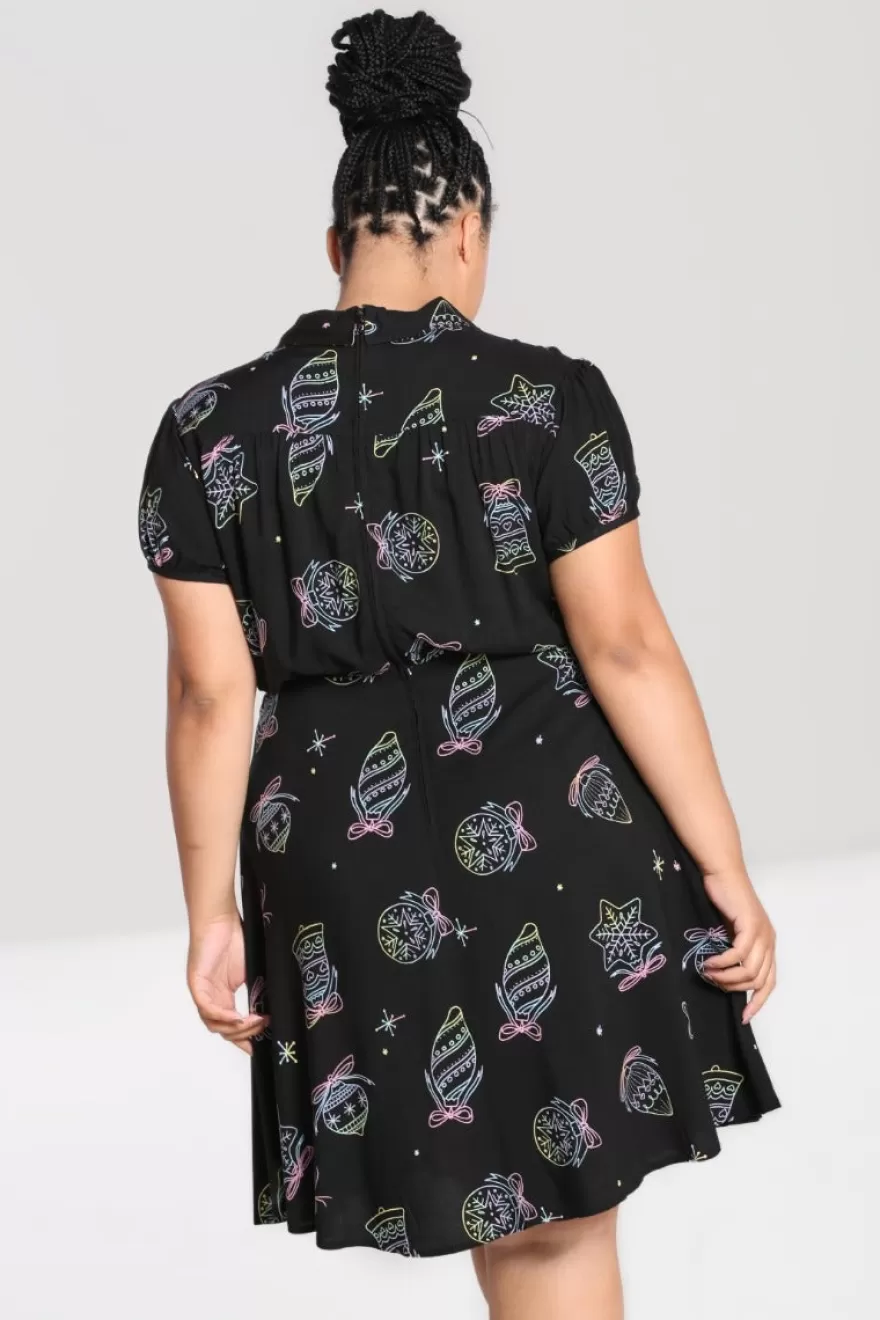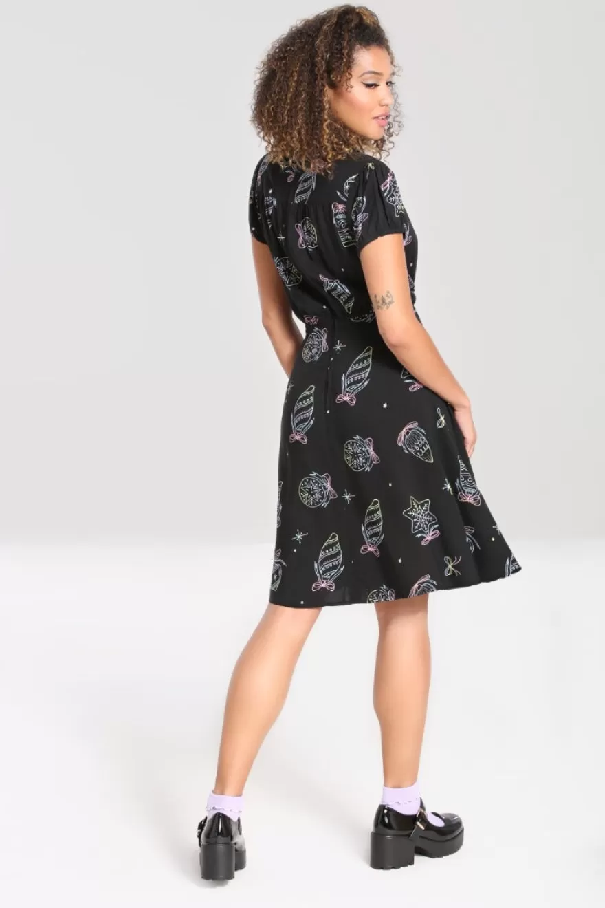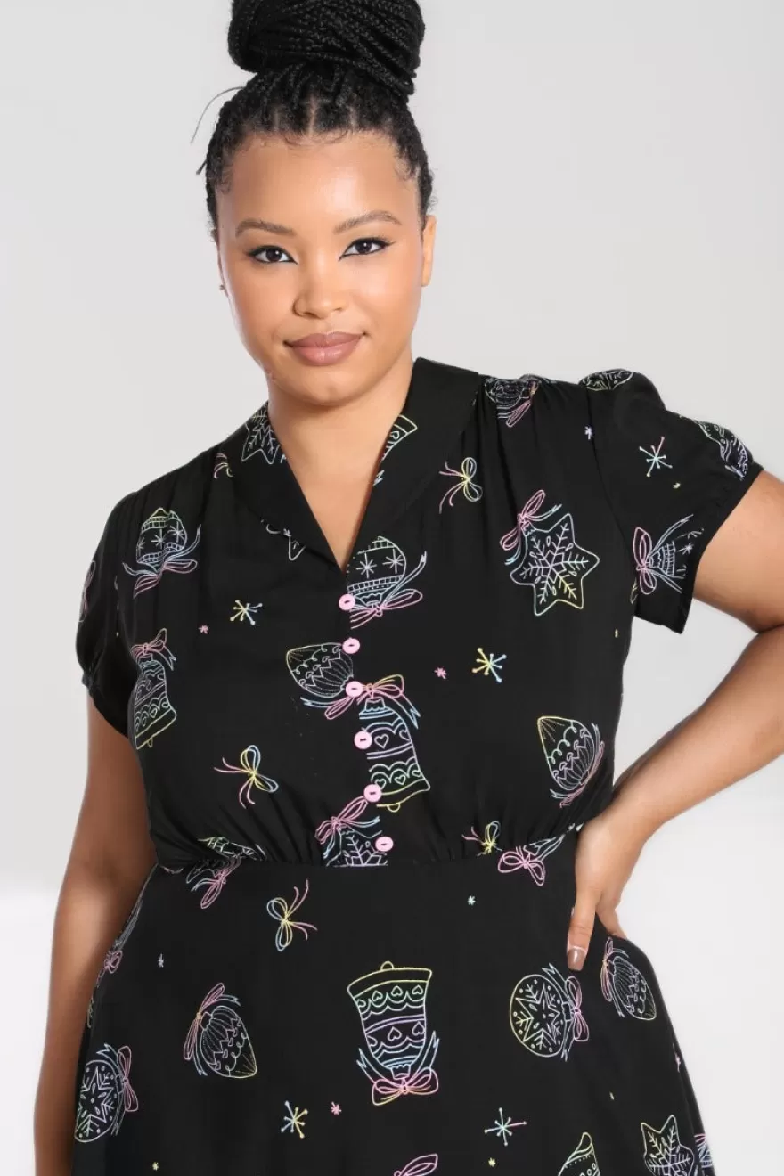Always merry & bright in our Merry Mid Dress.Black mid dress printed with pastel festive illustrations Framed by a flatt…