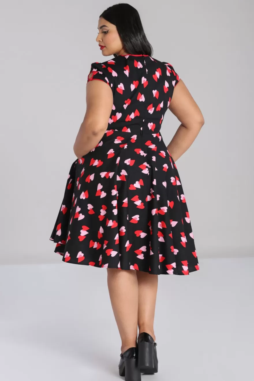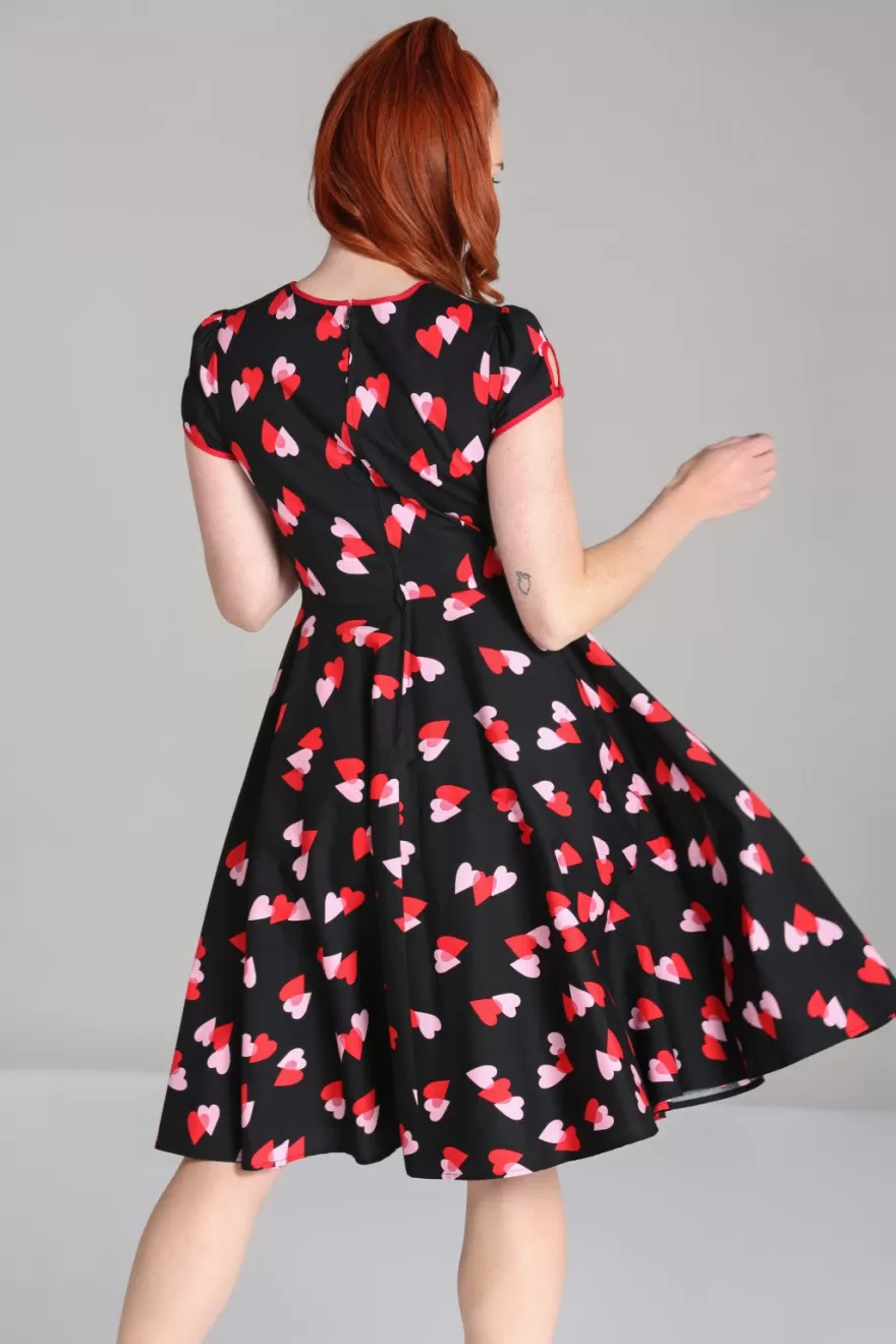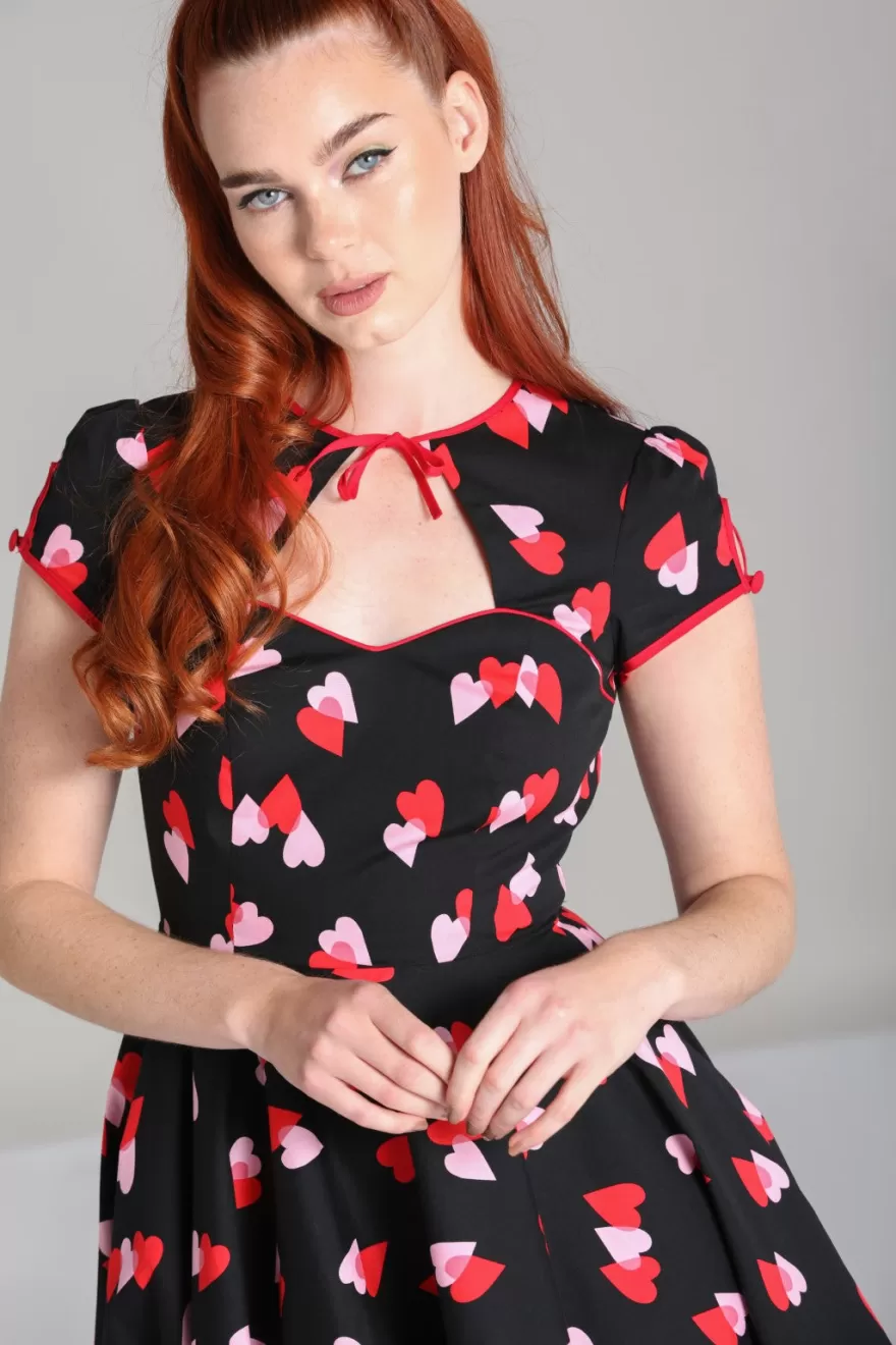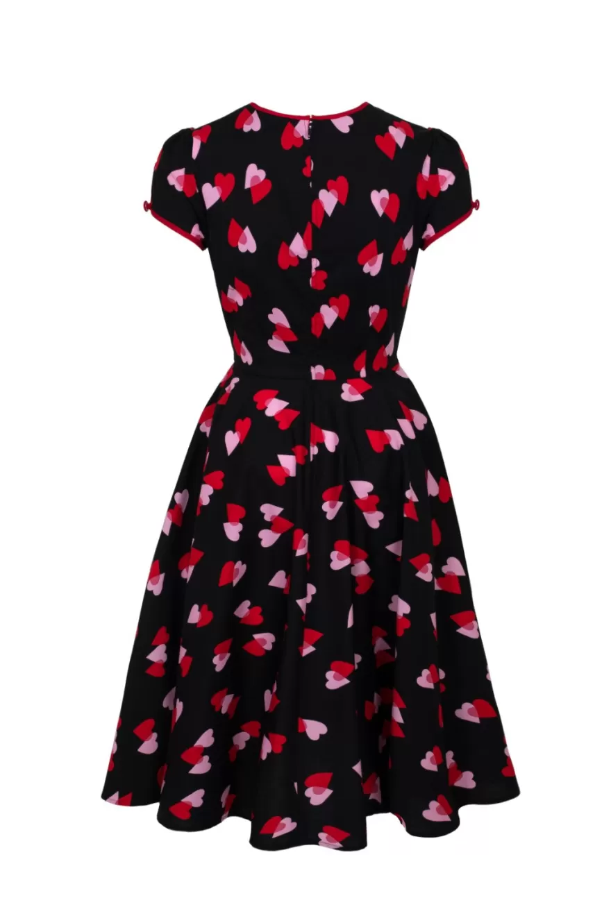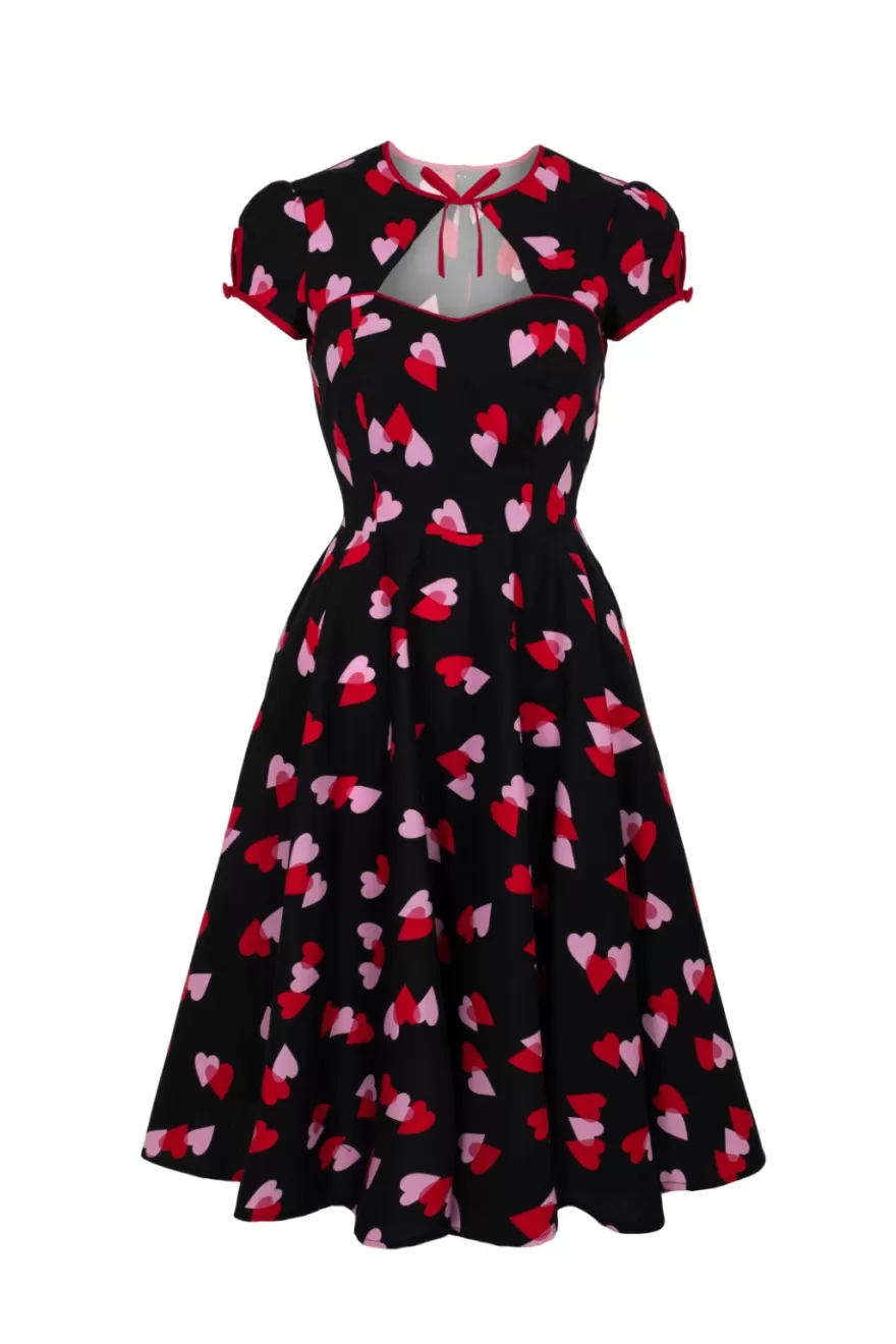 Printed stretch cotton 50’s style dressBlack base with red & pink hearts all over Bolero style panels across chest with …