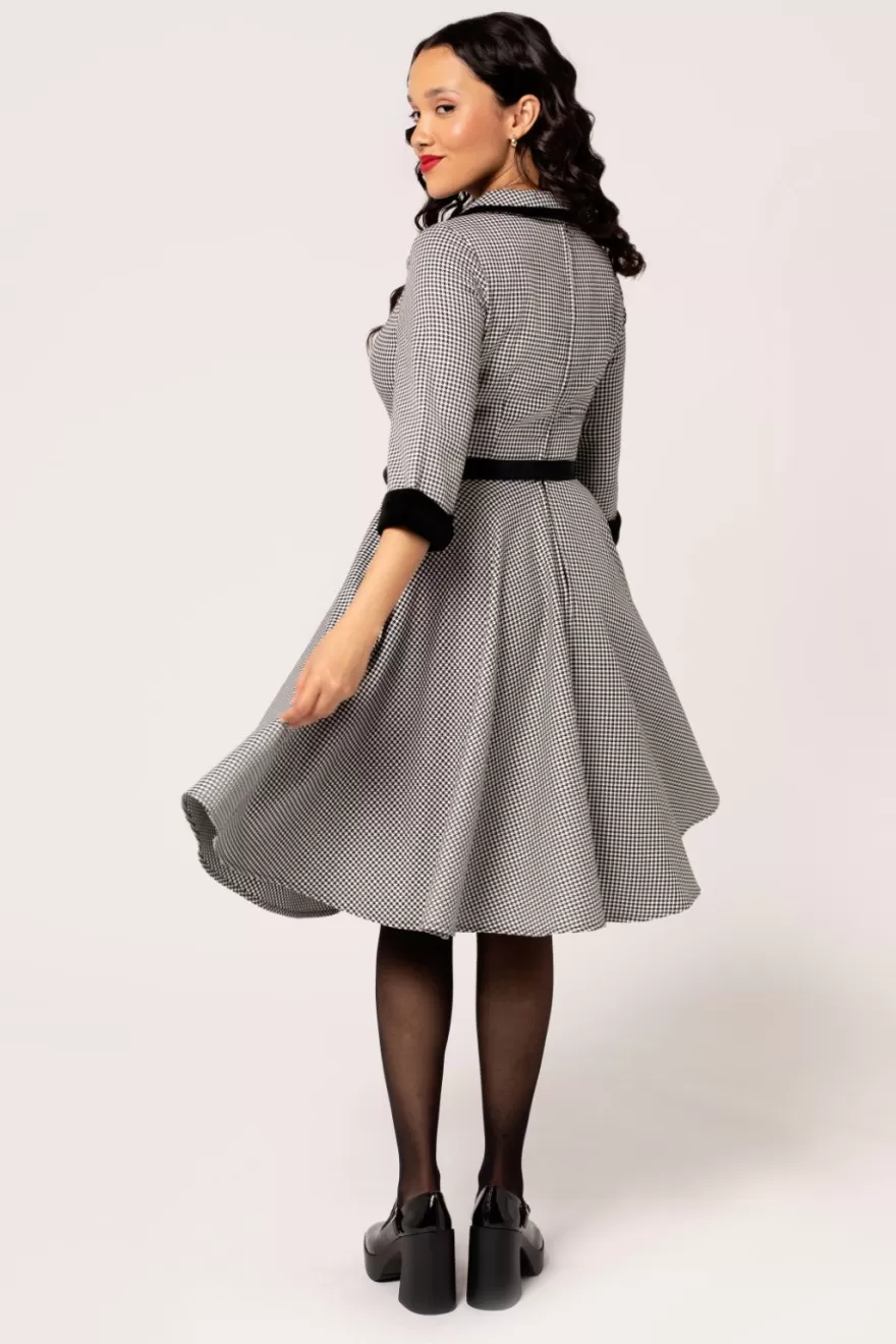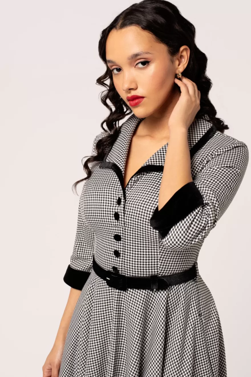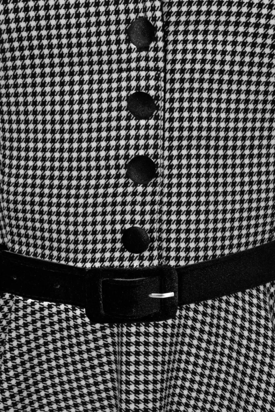 Black and white houndstooth midi dressV-neckline with decorative collar edging with black velvet 3/4 length sleeves with…