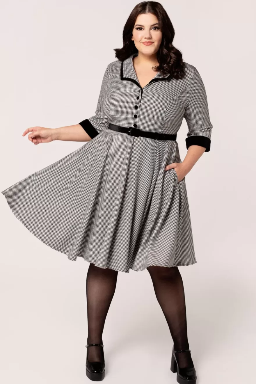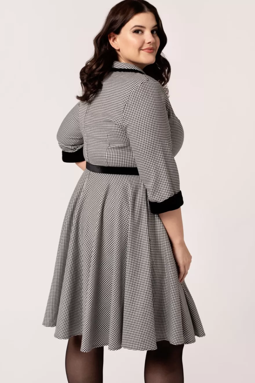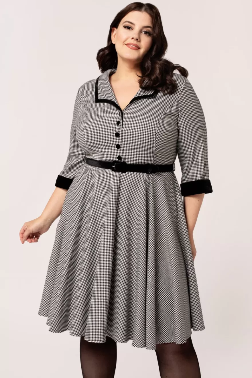 Black and white houndstooth midi dressV-neckline with decorative collar edging with black velvet 3/4 length sleeves with…