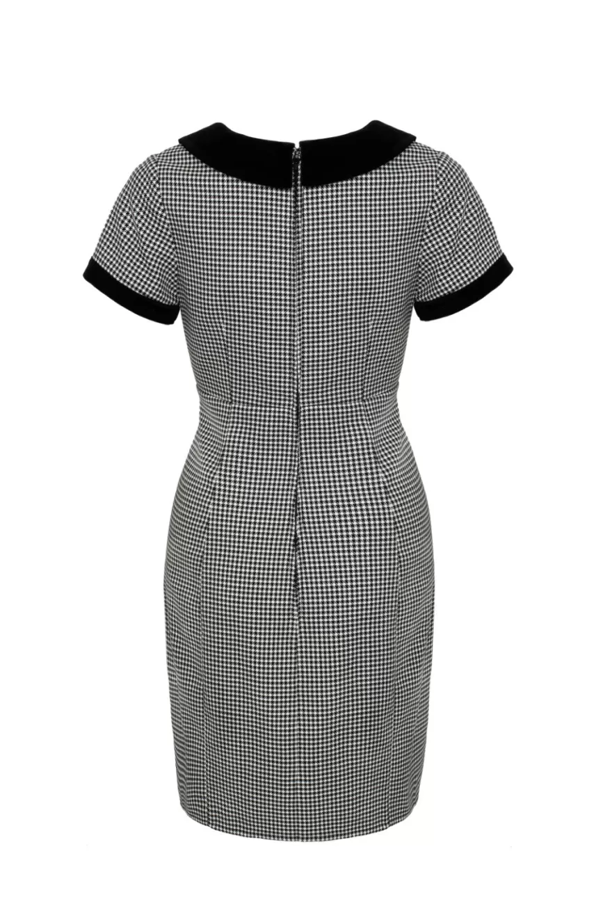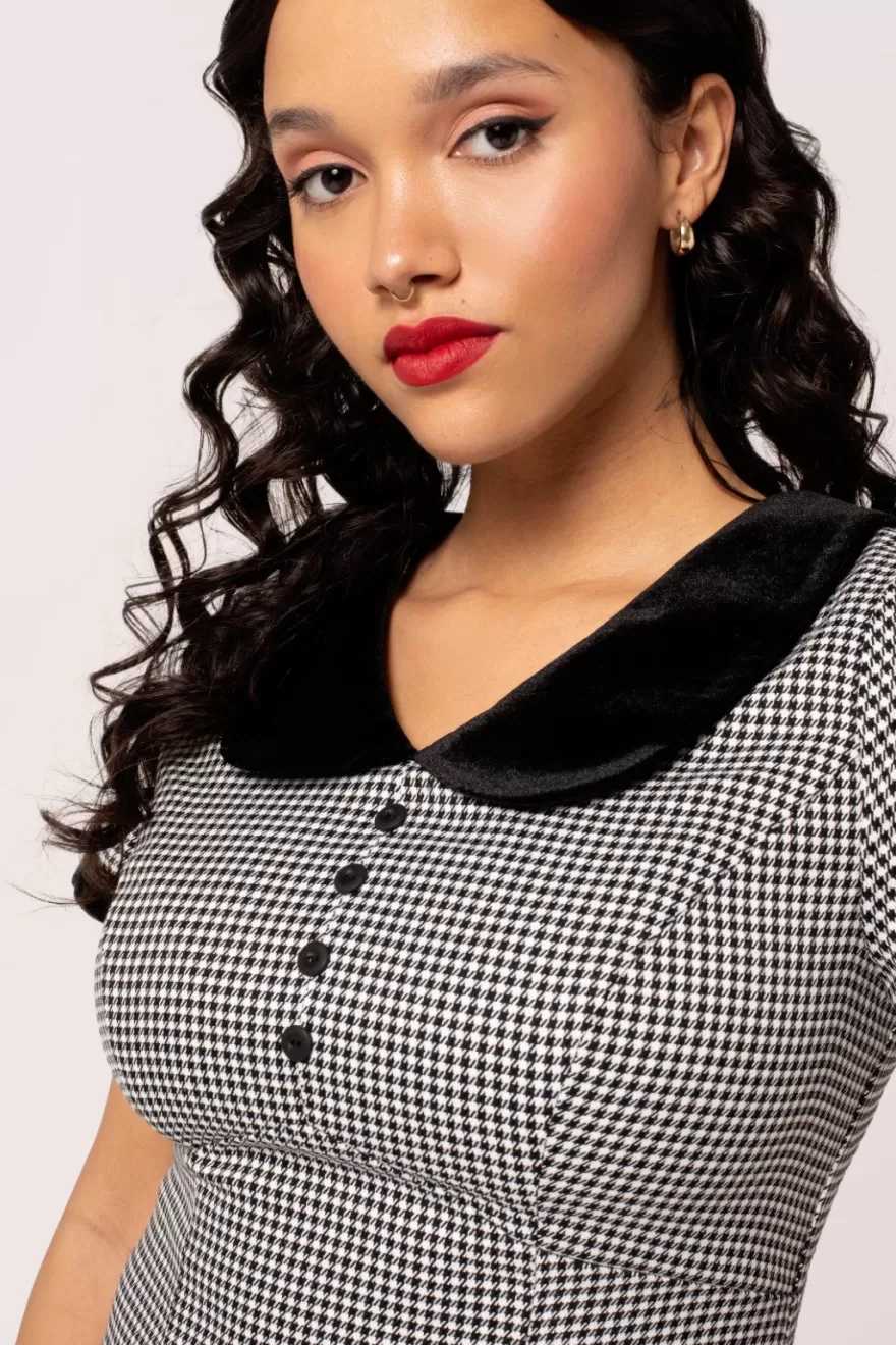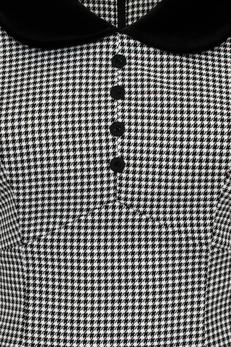 Black and white houndstooth mini dressSlight V neckline with curved collar in black velvetShort sleeves with black velve…