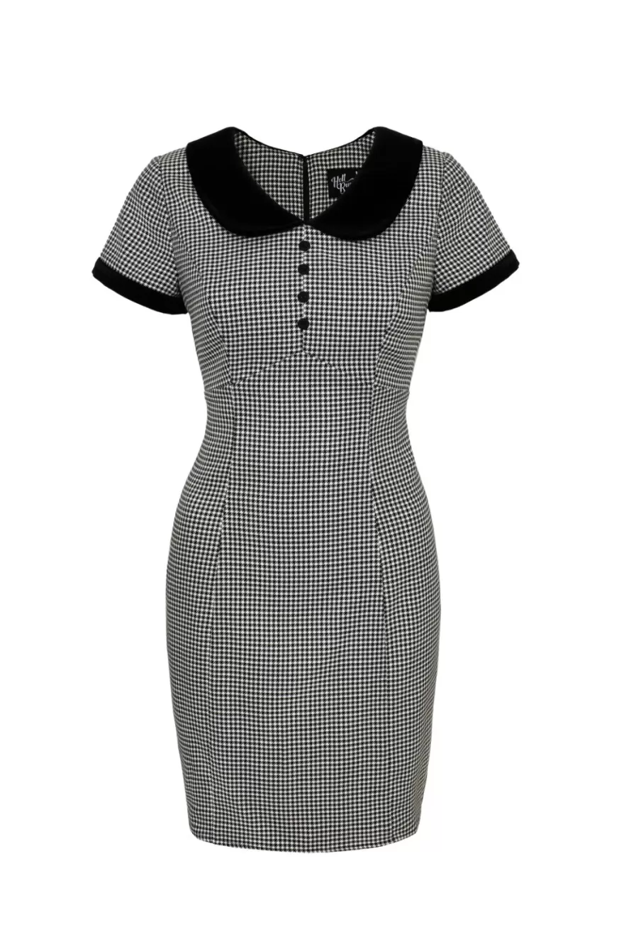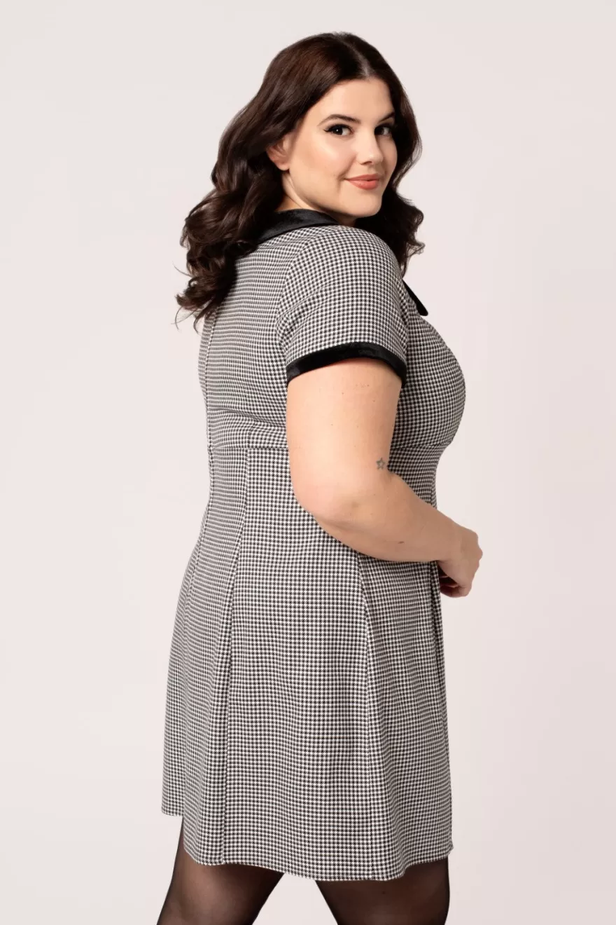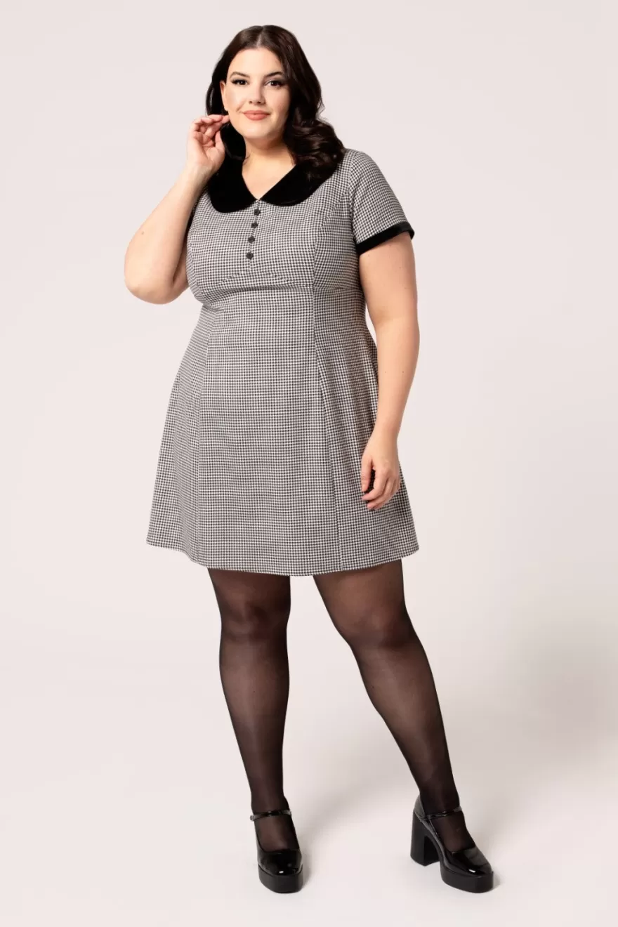 Black and white houndstooth mini dressSlight V neckline with curved collar in black velvetShort sleeves with black velve…