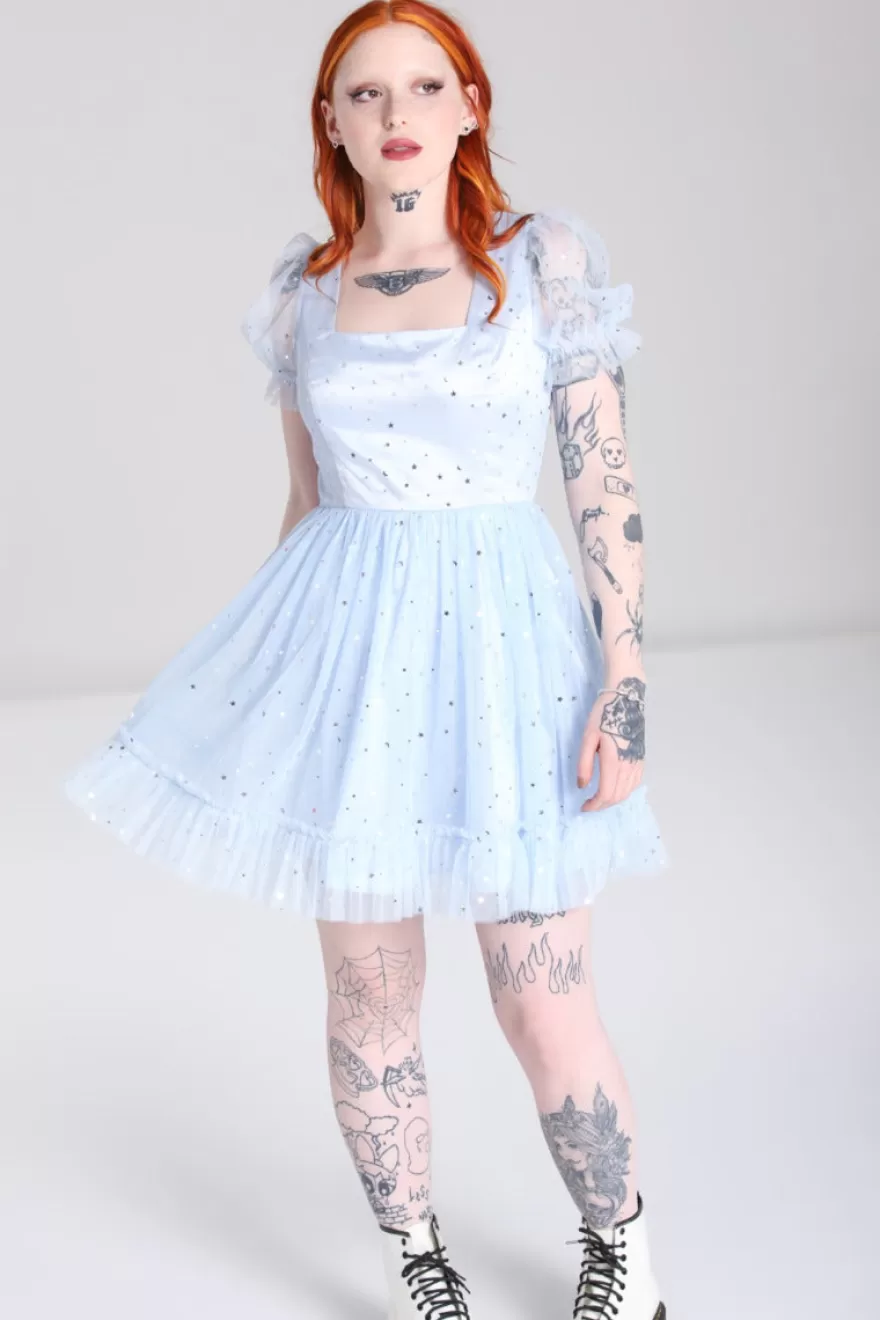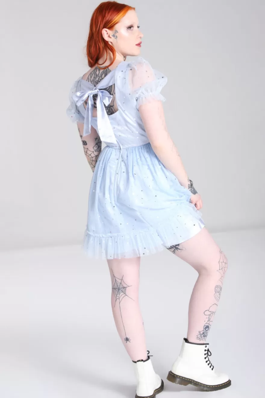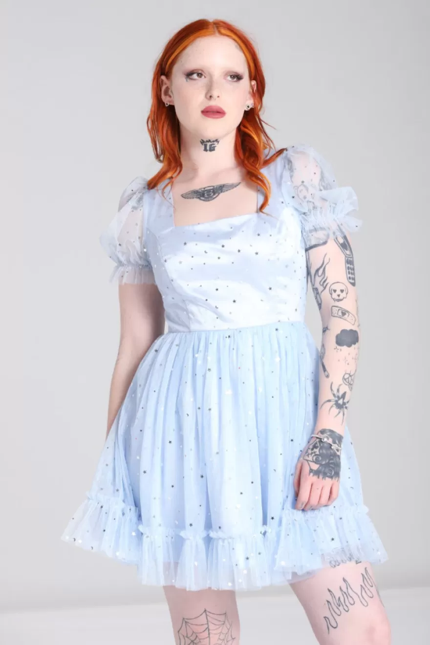 Tulle mini dress available in Black and Pastel BlueSparkley stars & moons on the tulle outer layerDress is lined in matc…