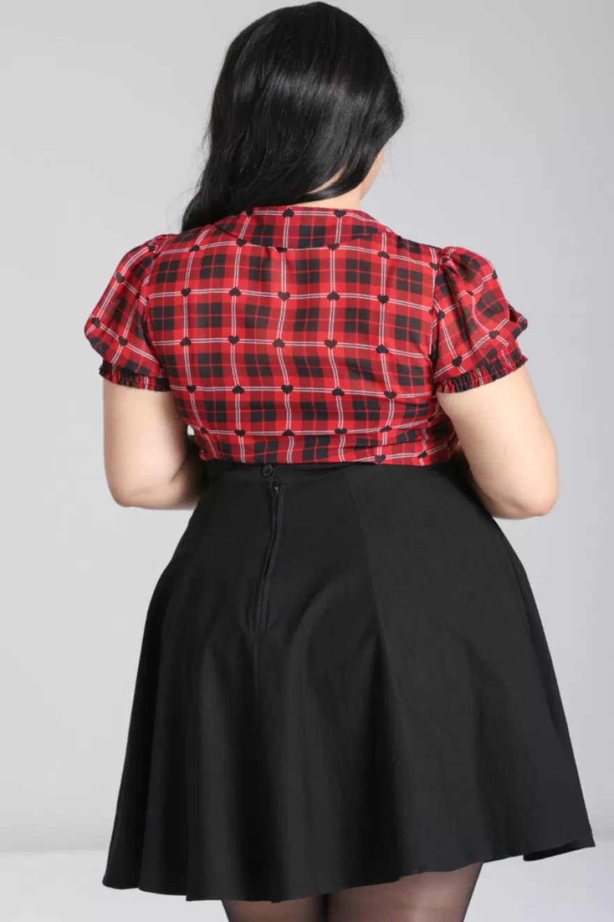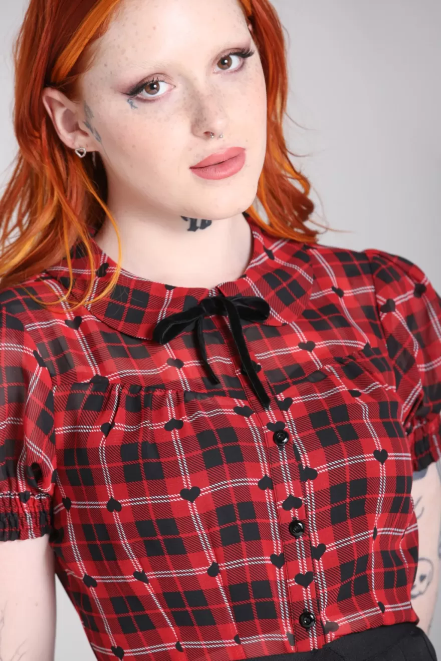 Semi fitted chiffon blouseRed and black printed tartan with little black heartsRemovable black velvet tiePeter pan colla…