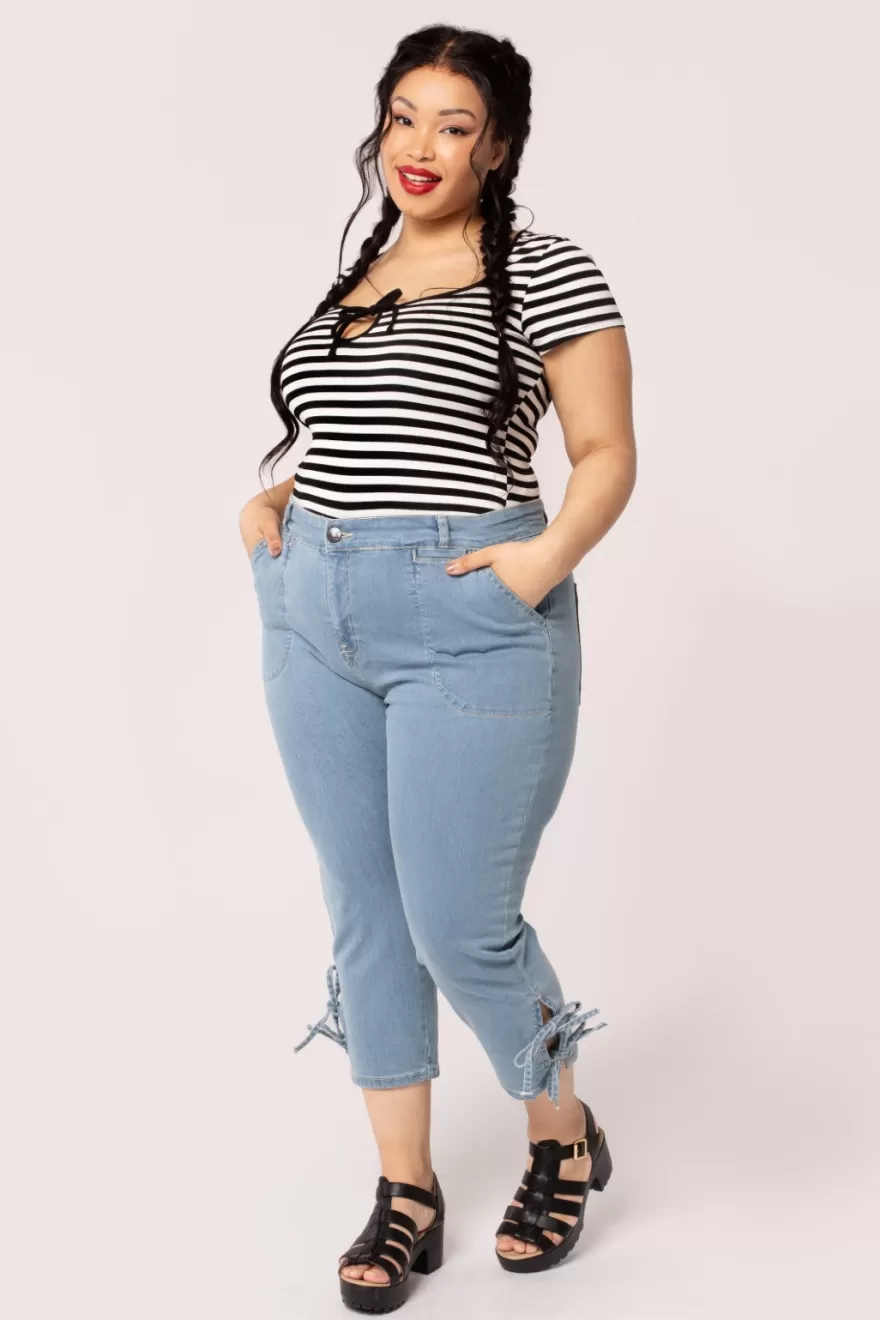 Stretchy light blue denim jeansCropped length with side spilt and 2 ties in self fabric detailing Waistband with belt lo…