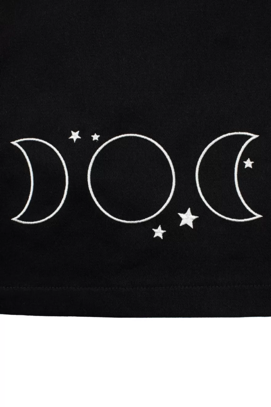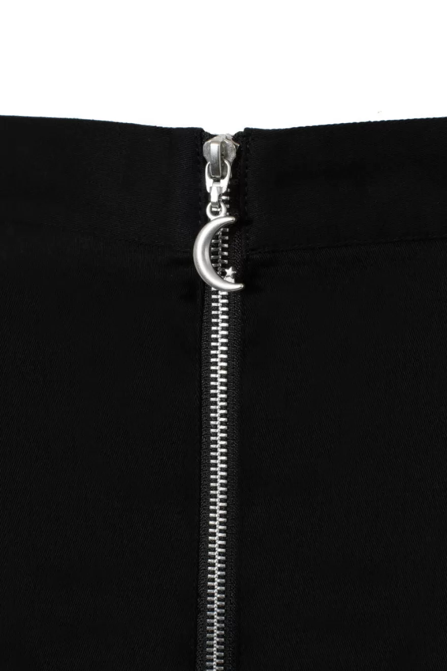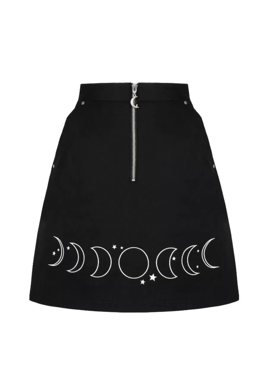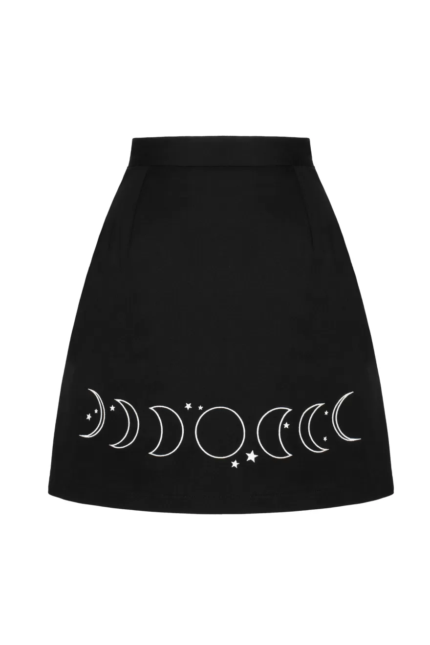 Fitted black mini skirtContrasting embroidery of moon faces along hem 2 front pockets from waistband with silver studsWa…