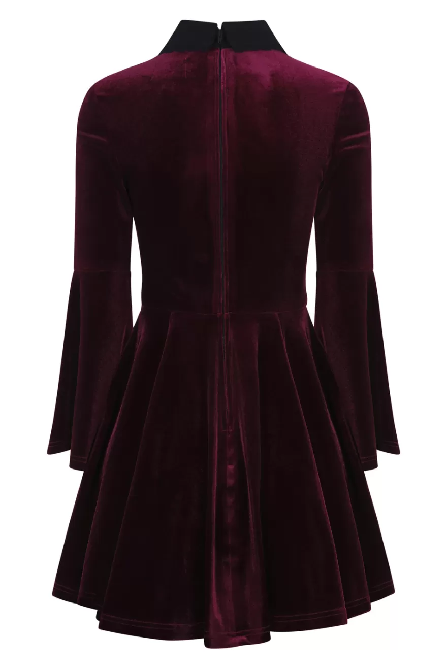 Wine coloured dress with black trimsWaist seam.Set in waistband in self fabric.Bell sleeves in self fabricPlacket with b…