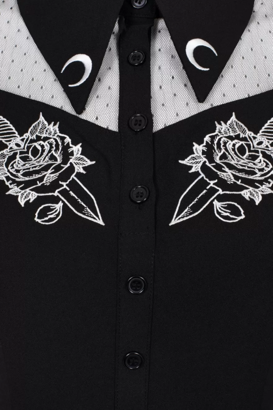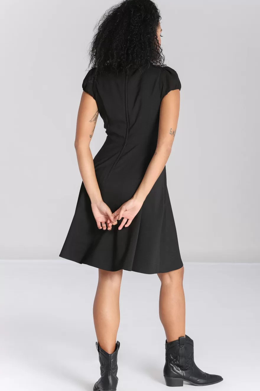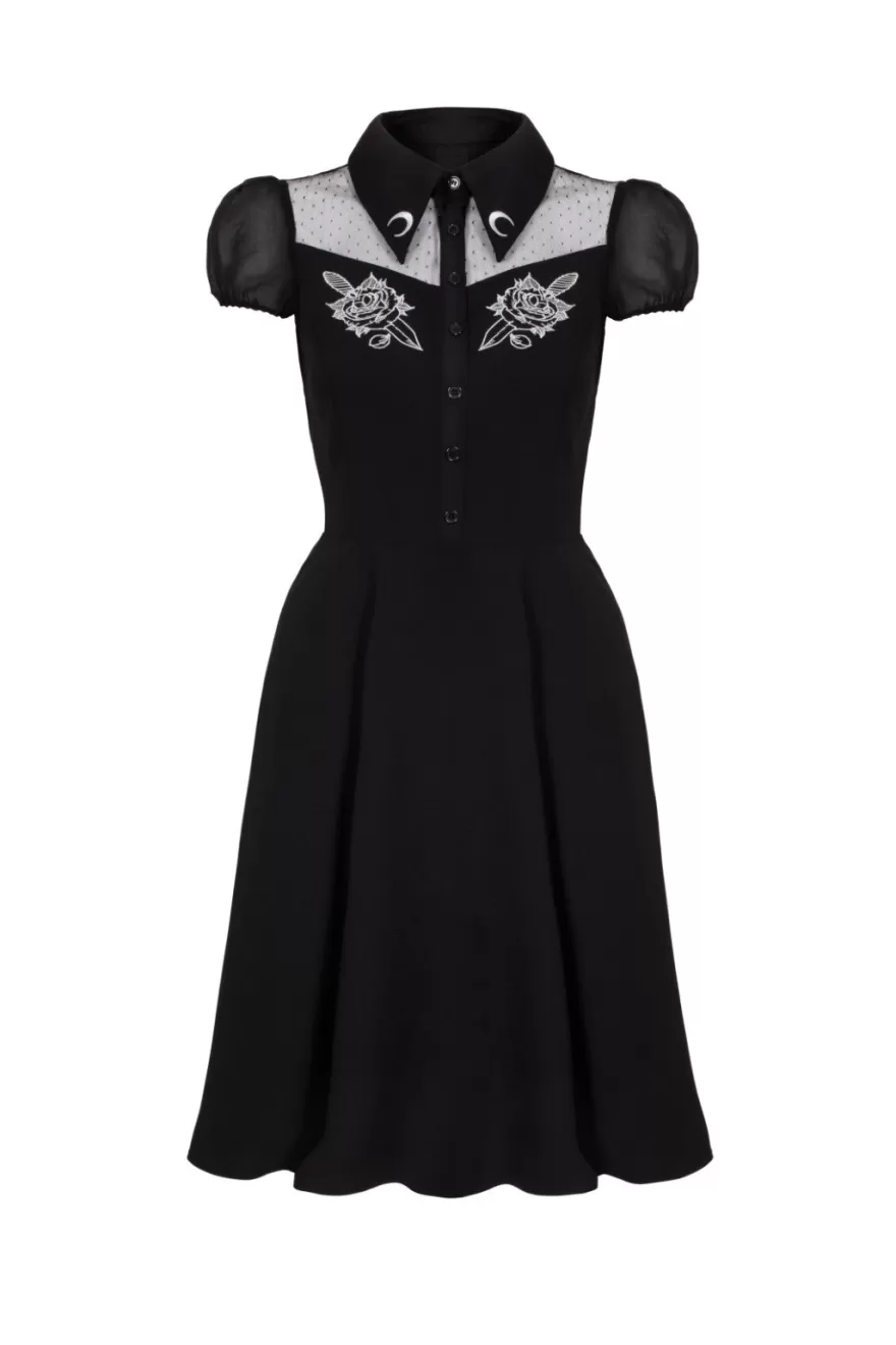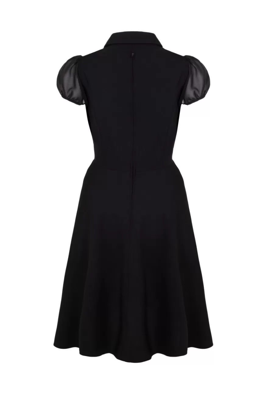 Black mid length dressFitted bodice with cut out detail on chest with black polka dot meshPointed stand up collar with w…