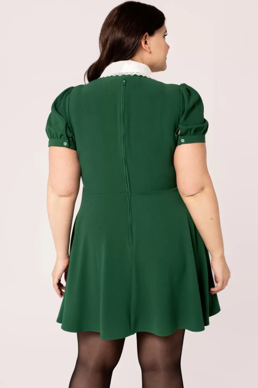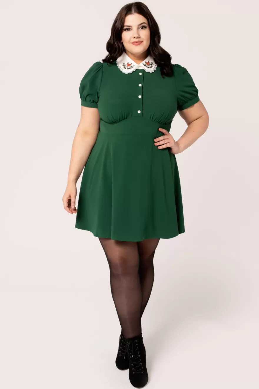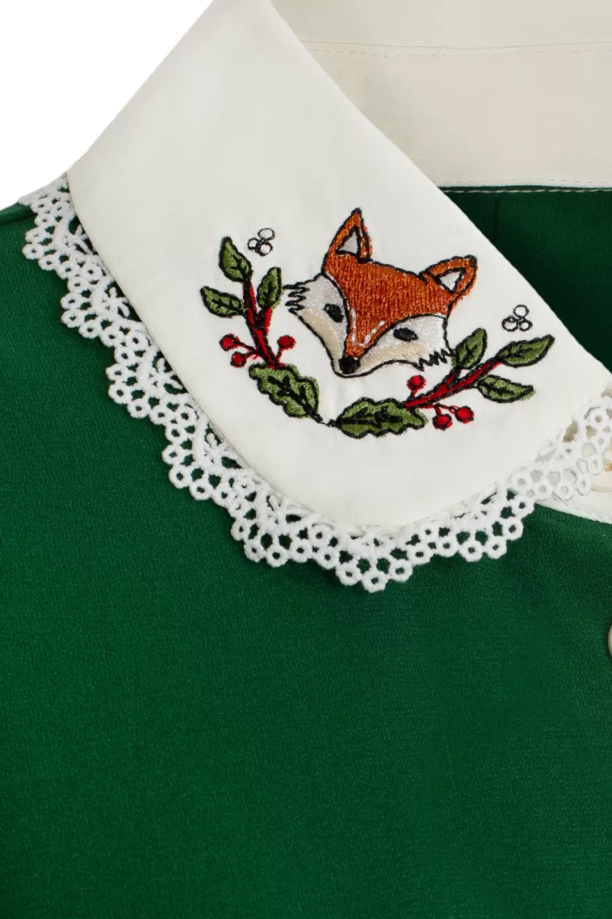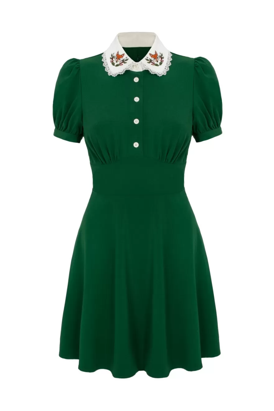 Green mini dressIvory stand up collar with fox embroidery detailLace trim around collarShort puff sleeves with button cu…