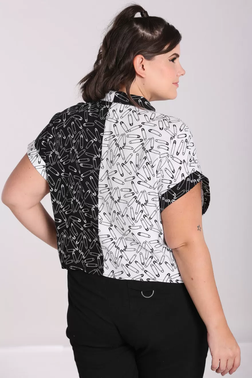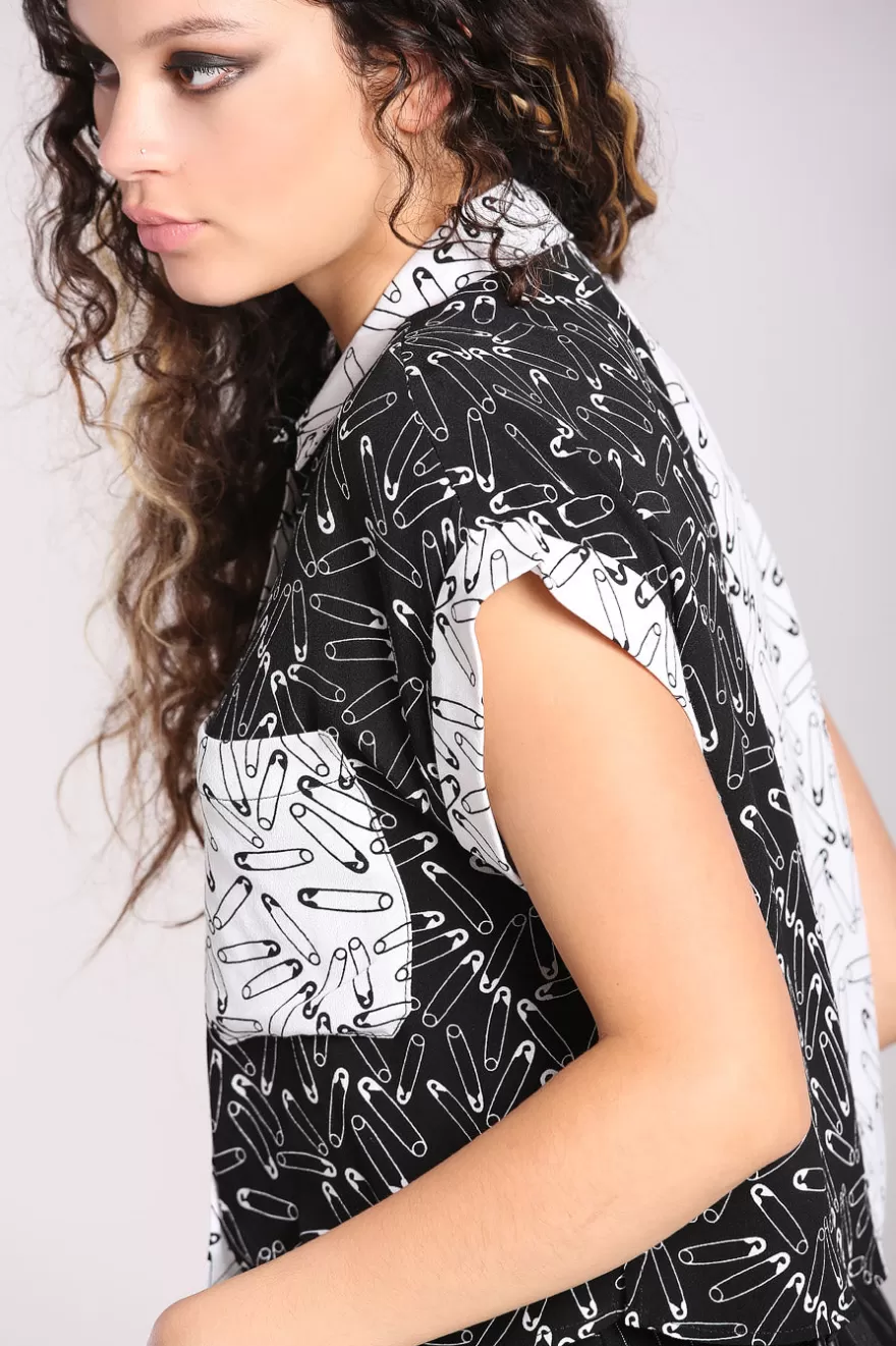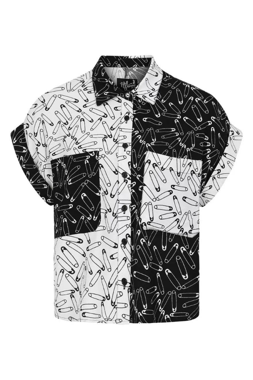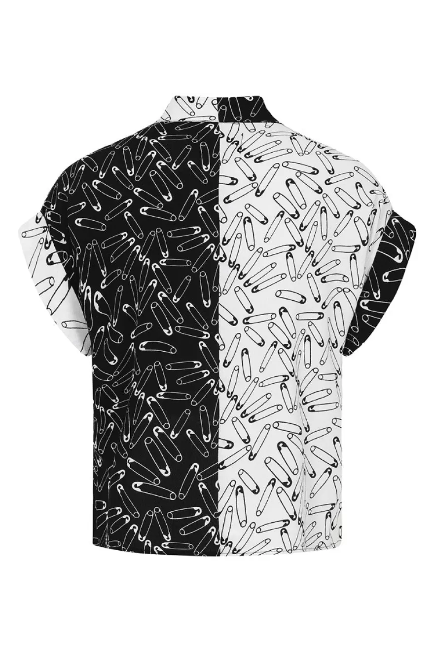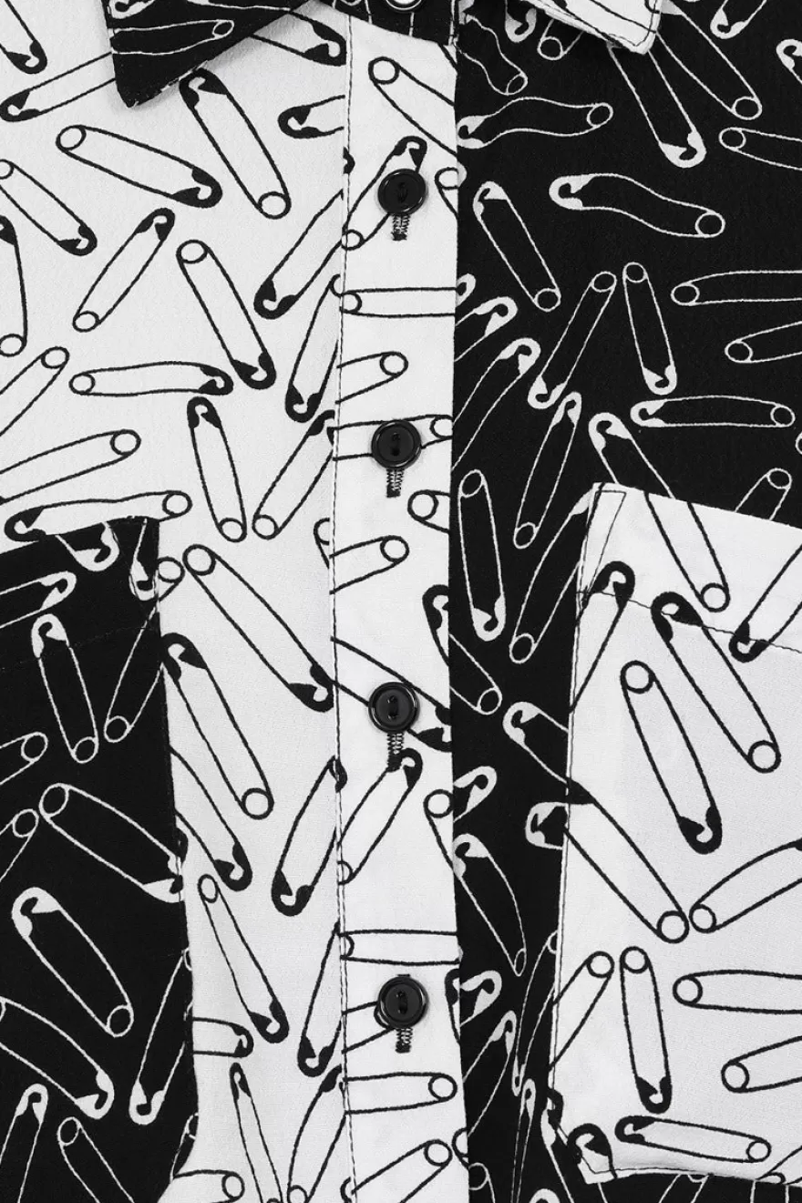 Viscose printed shirtHalf black & half white fabric with contrasting safety pin graphicsPointed collar Button up placket…