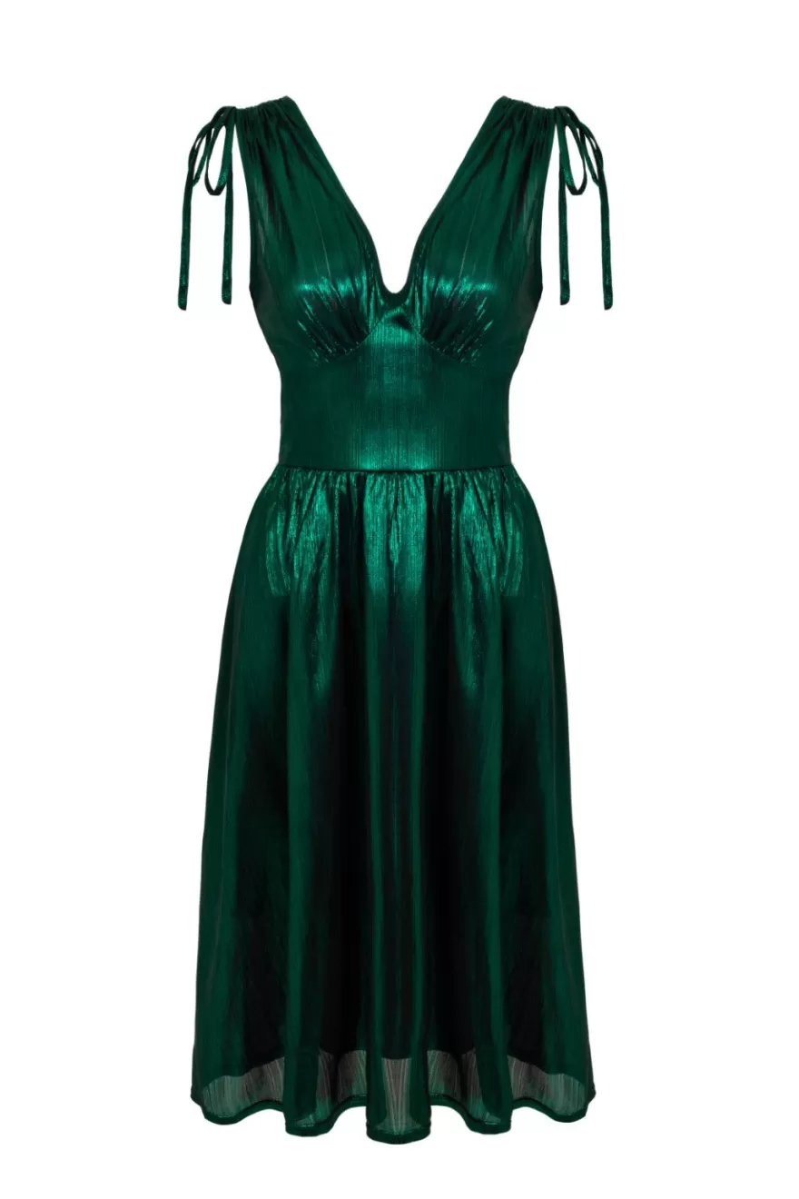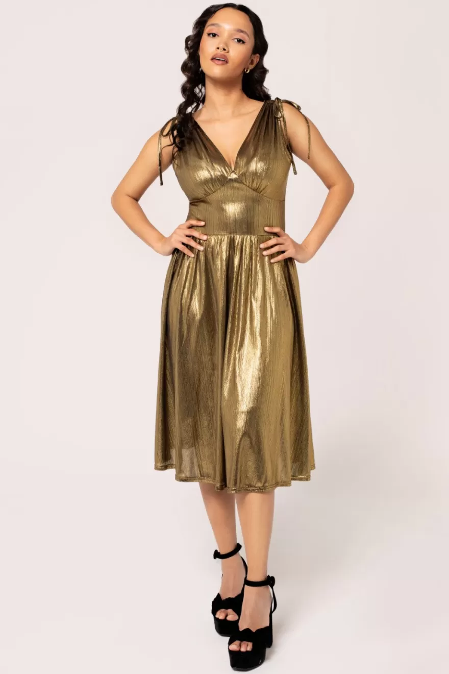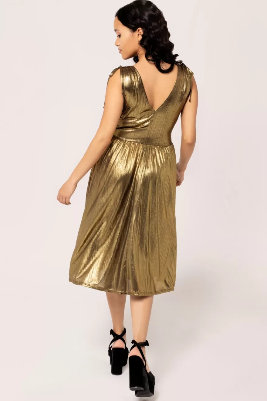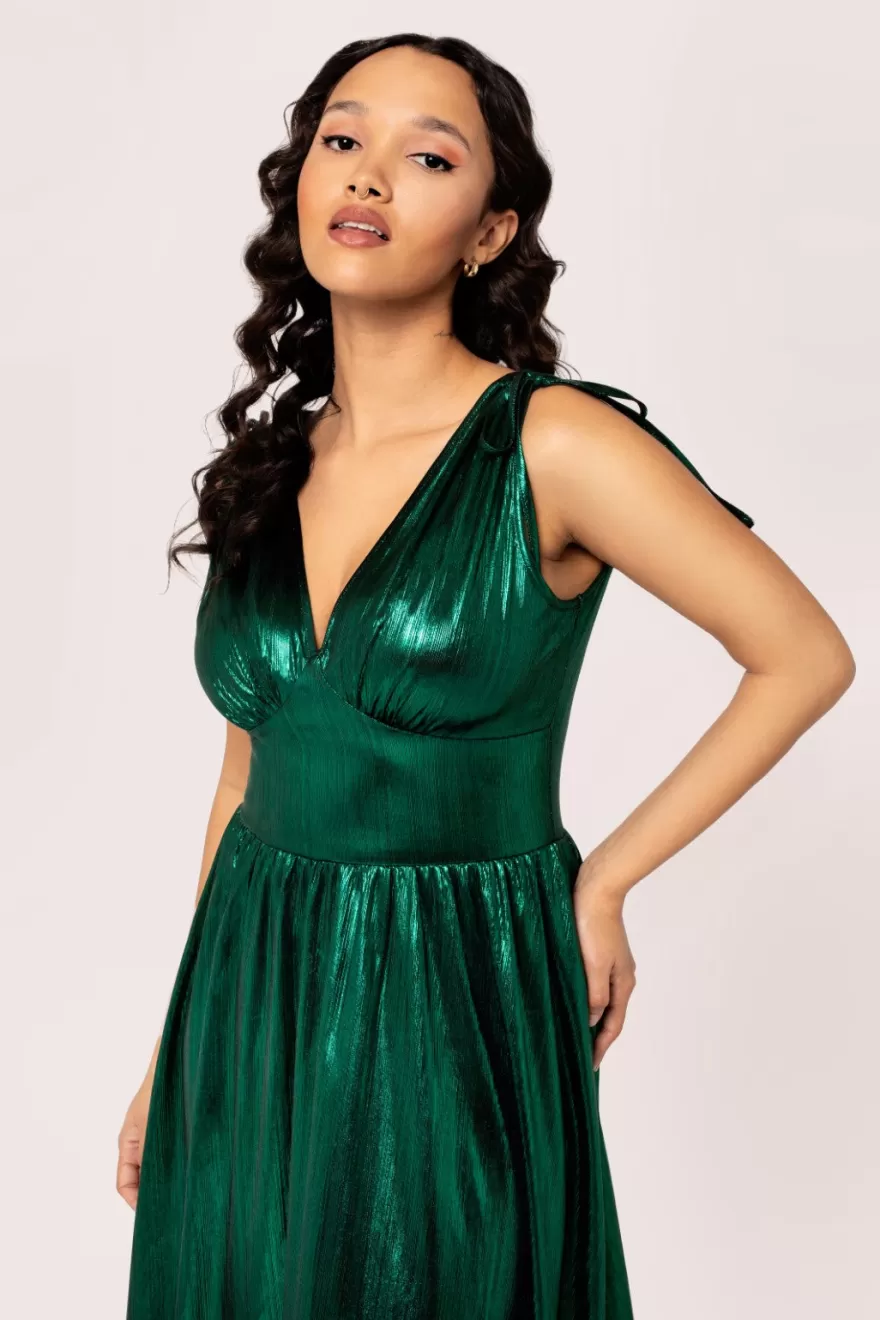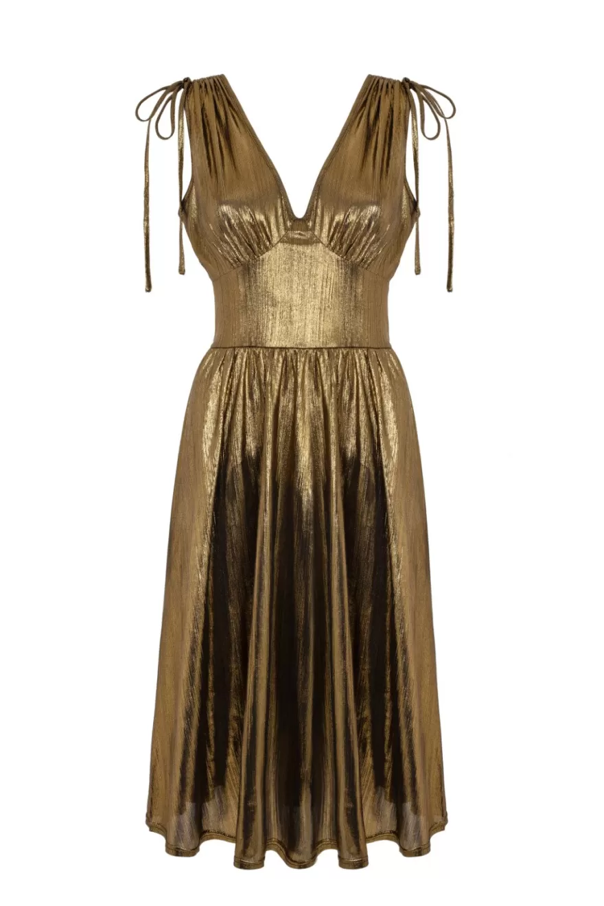 Available in Green and GoldMetallic midi dressSleeveless V neckline bodice Gathering detail with ties at shoulders Fitte…