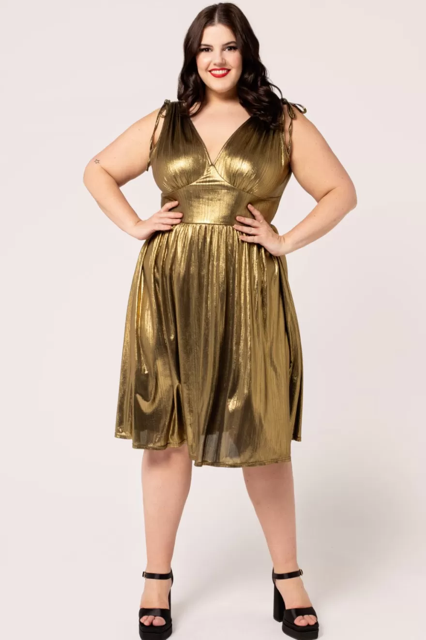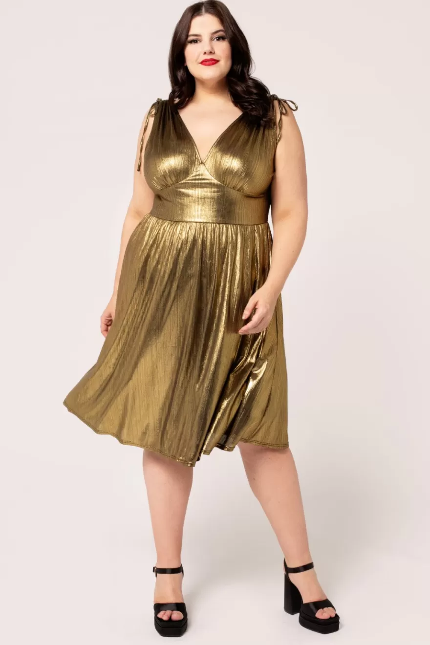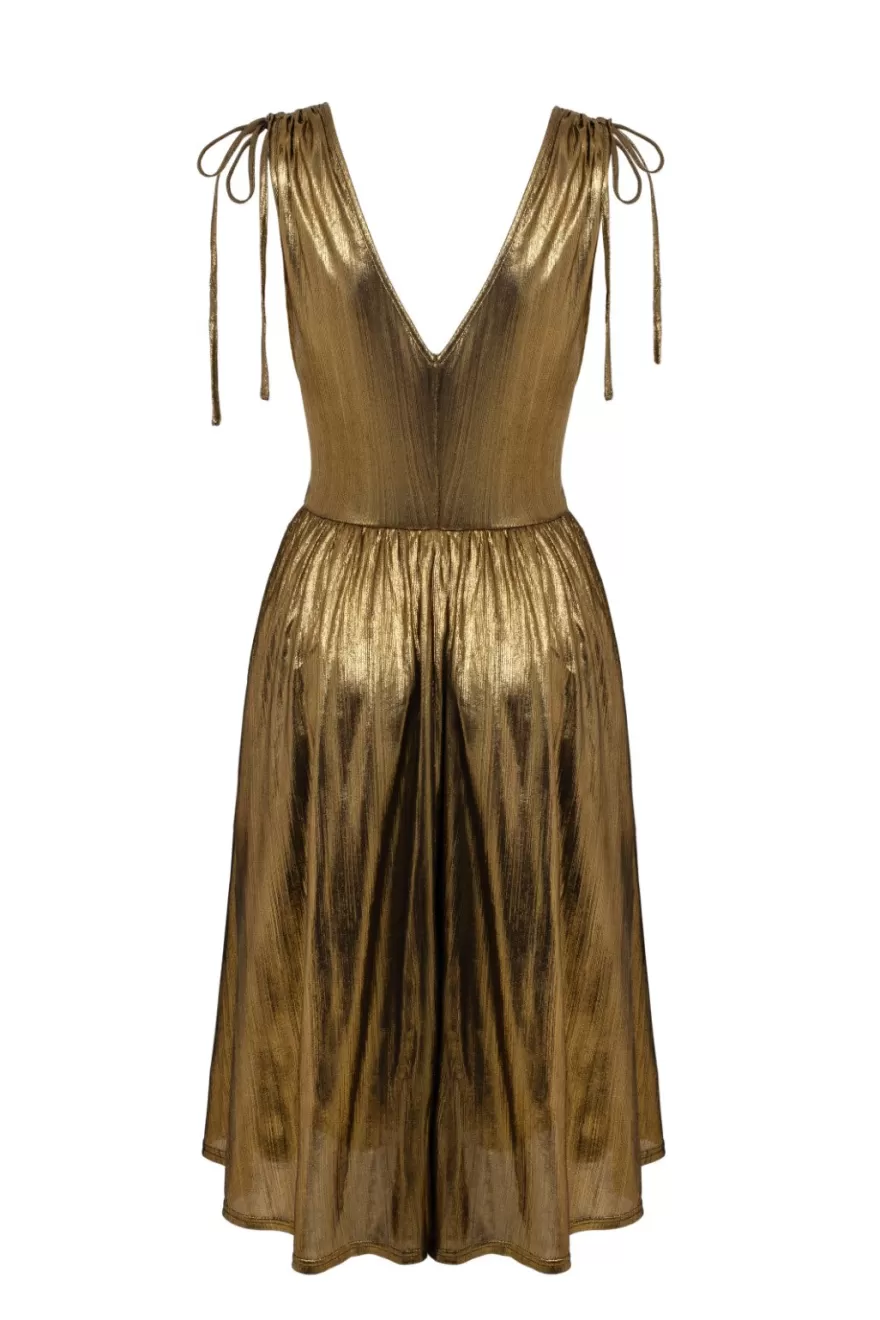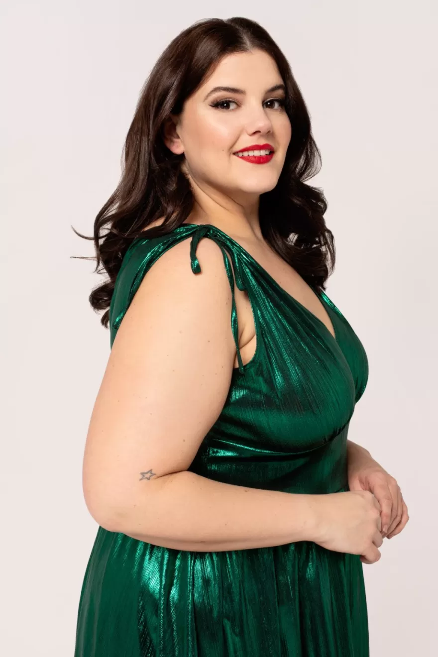Available in Green and GoldMetallic midi dressSleeveless V neckline bodice Gathering detail with ties at shoulders Fitte…