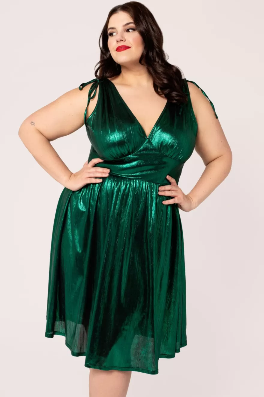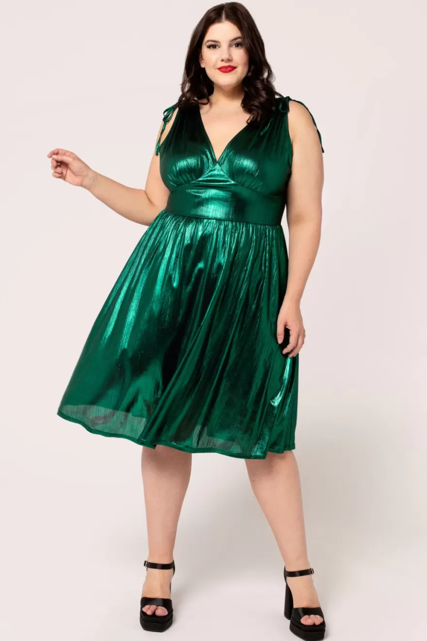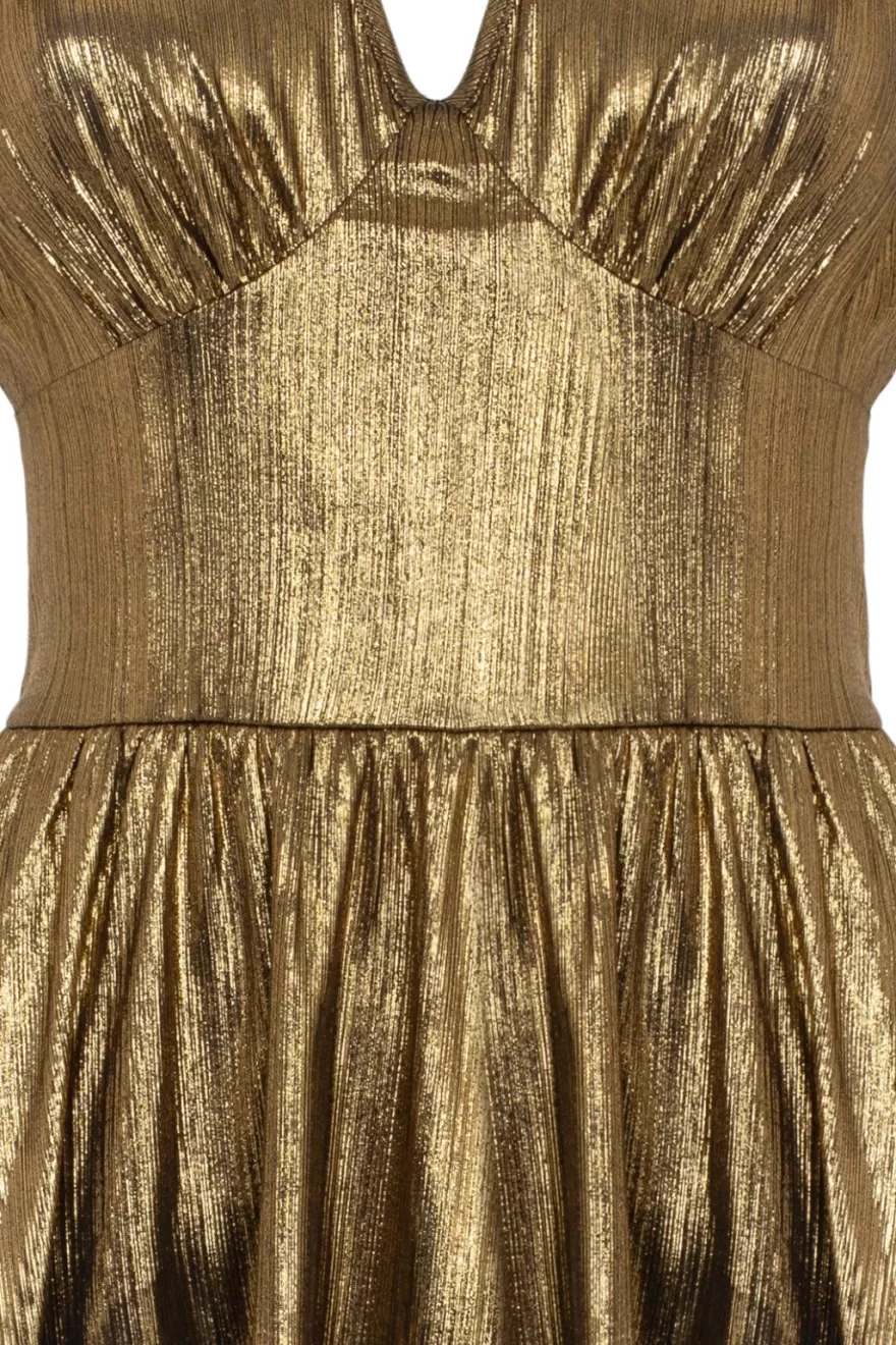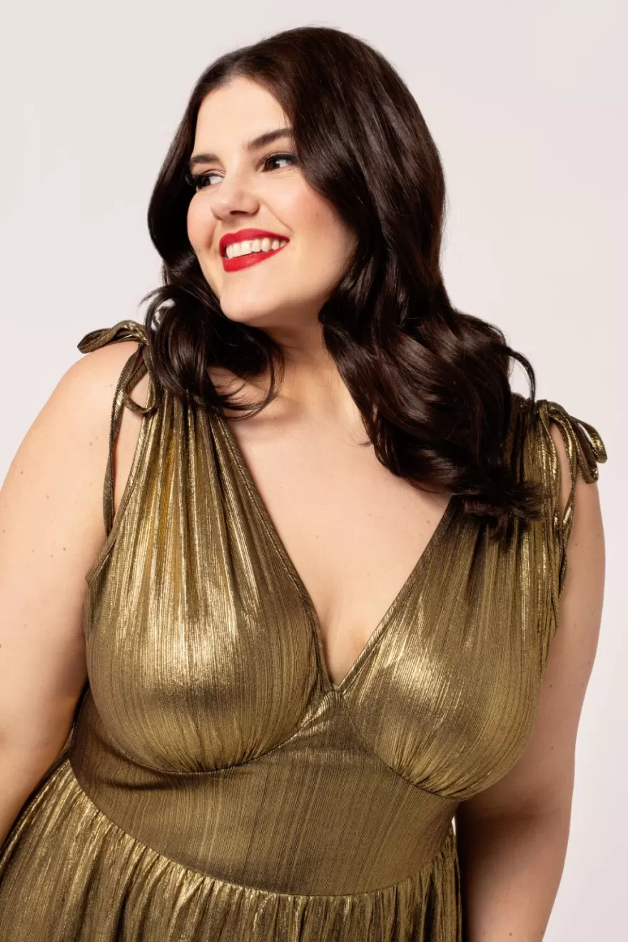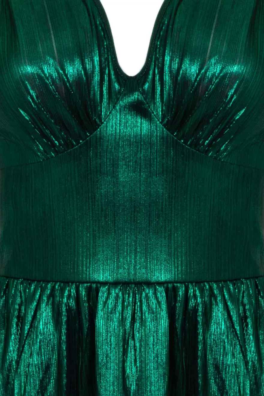Available in Green and GoldMetallic midi dressSleeveless V neckline bodice Gathering detail with ties at shoulders Fitte…