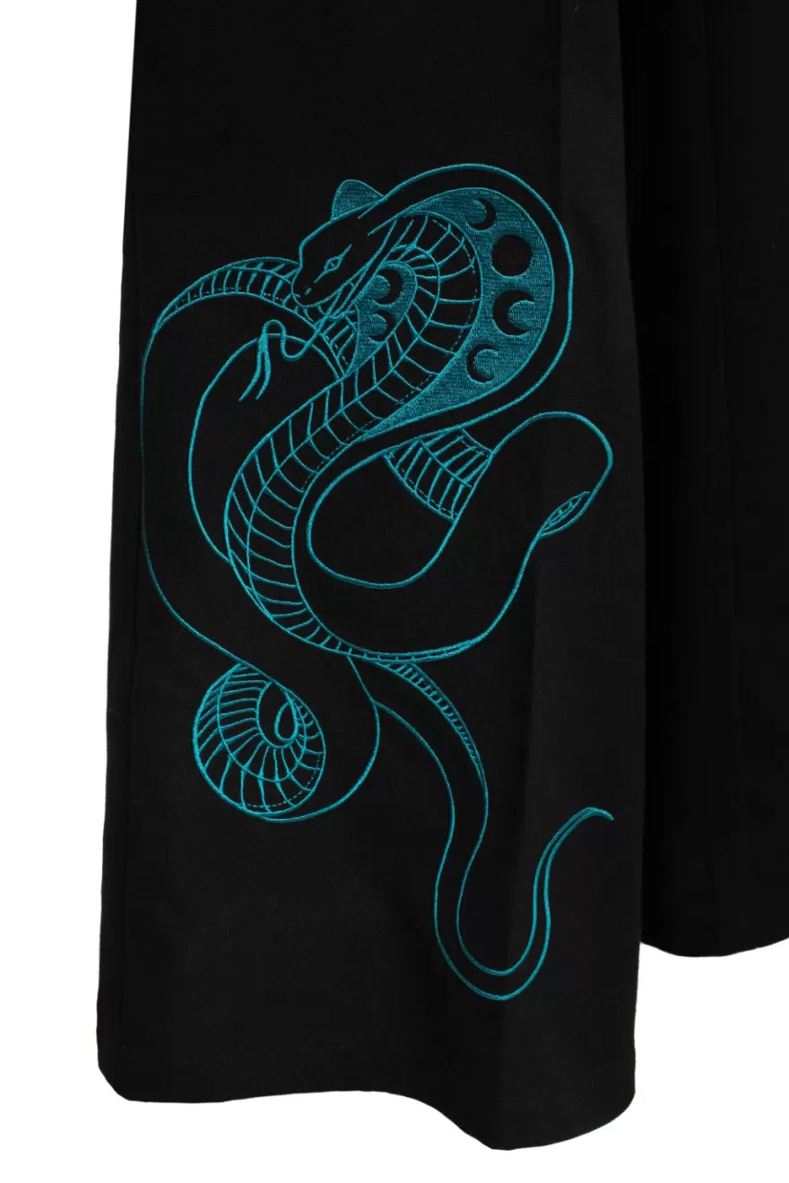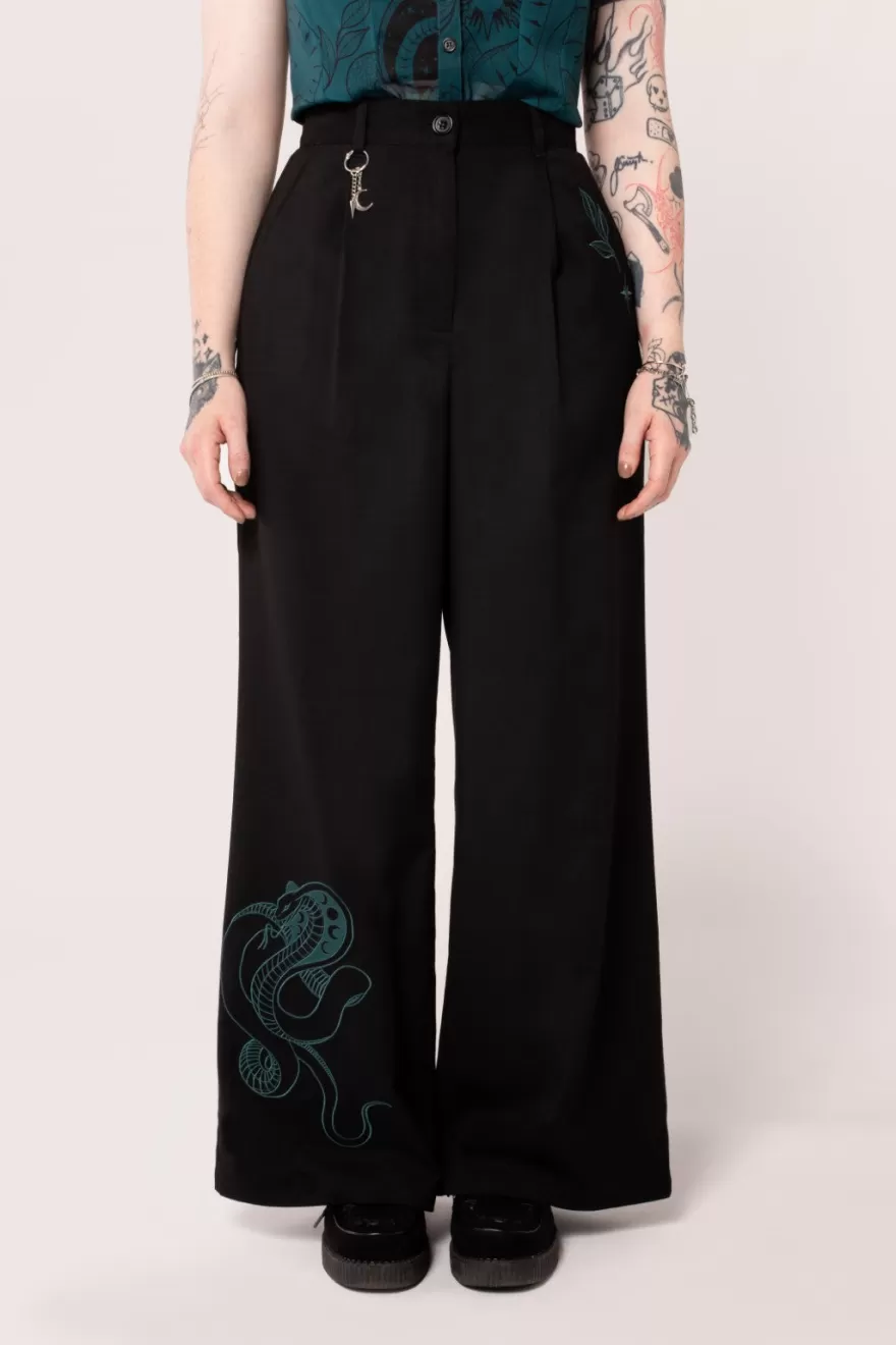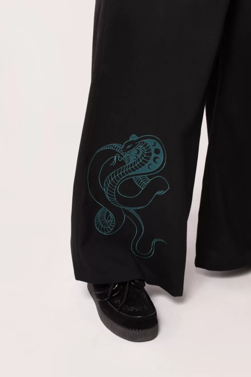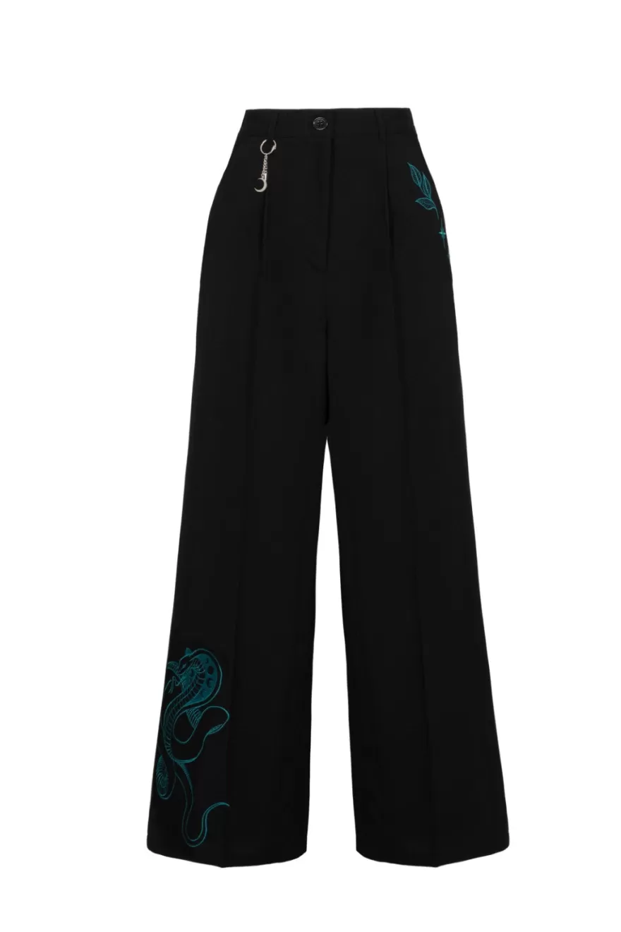 Black wide leg swing trousers Tailored like fabric Large teal snake embroidery on front of one legDetachable silver char…