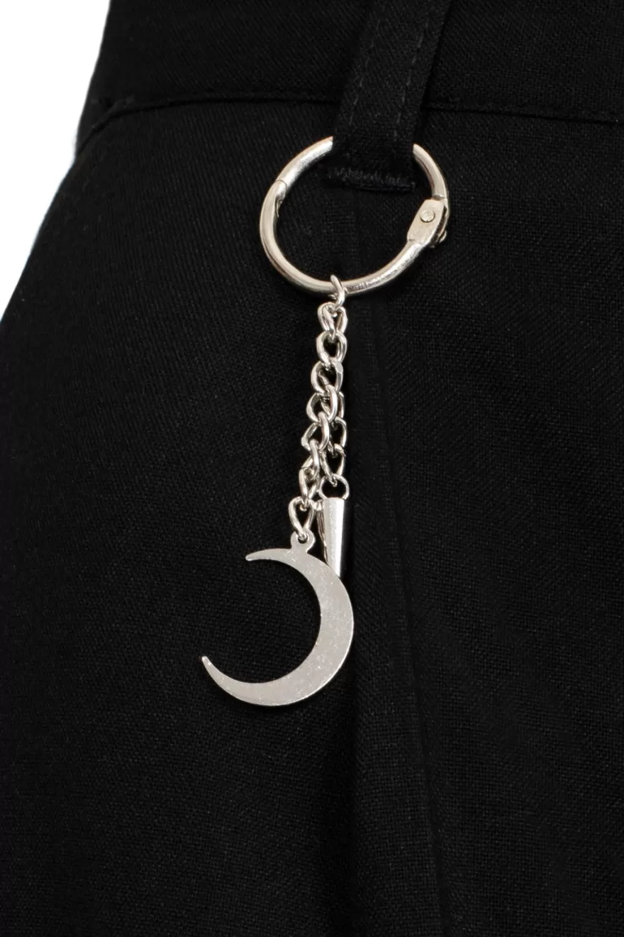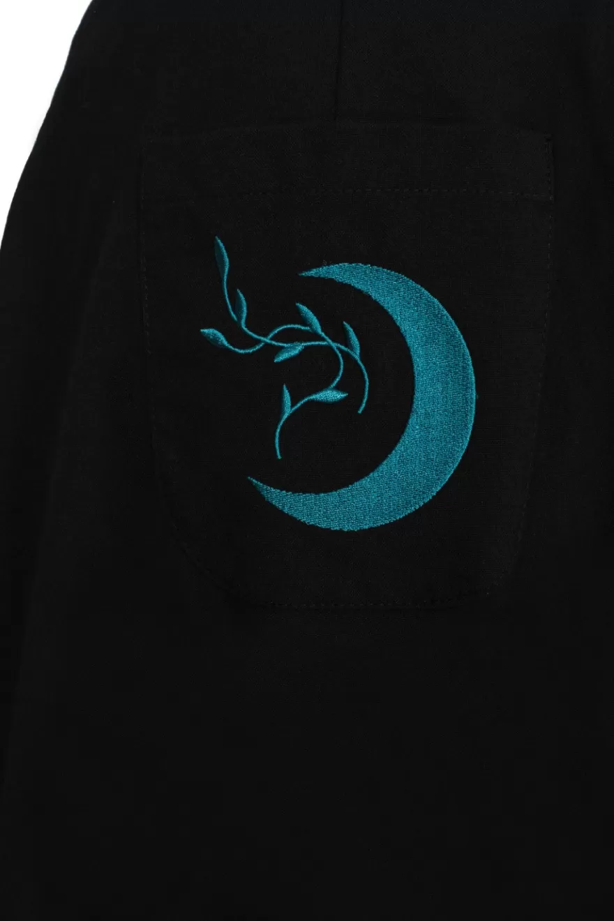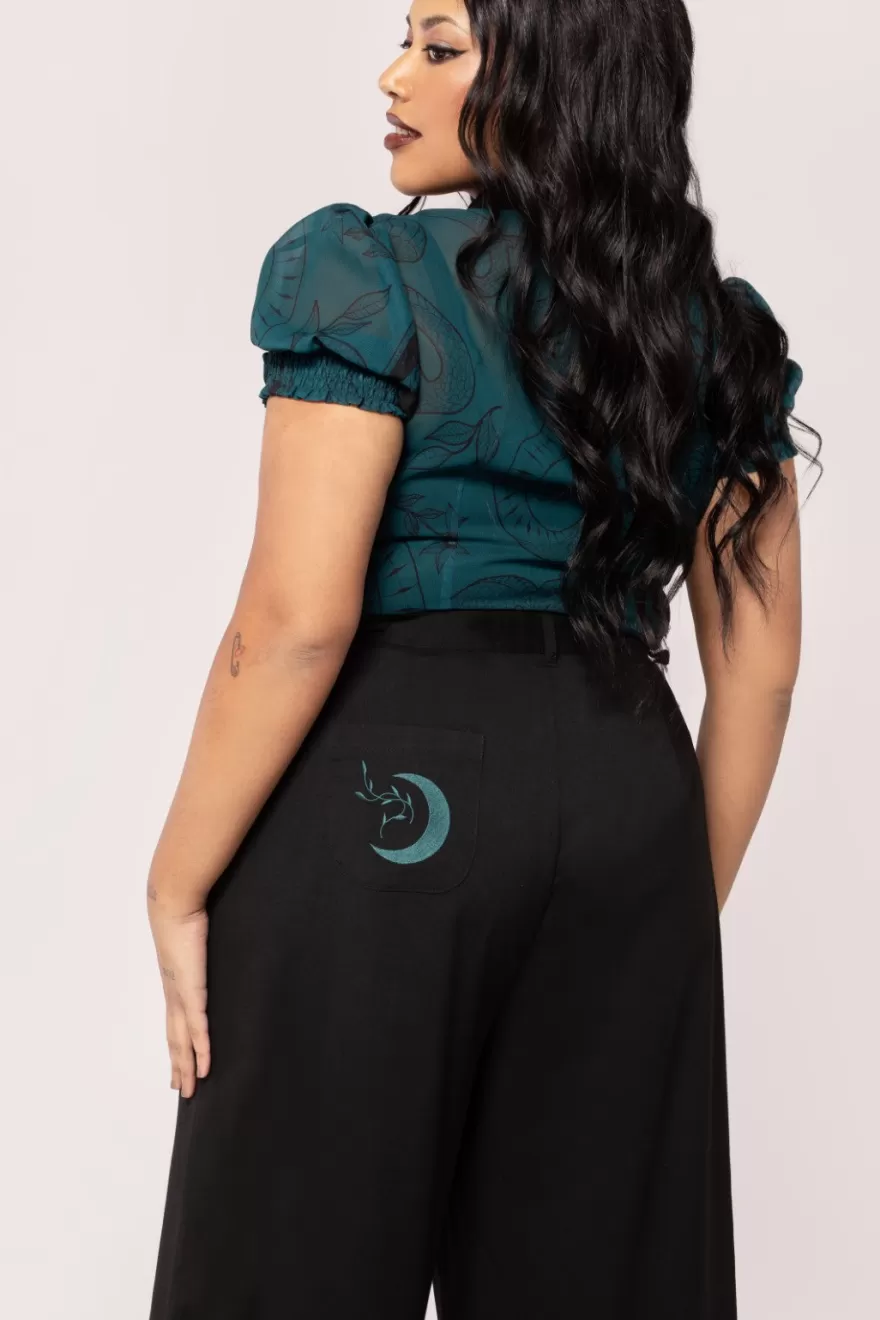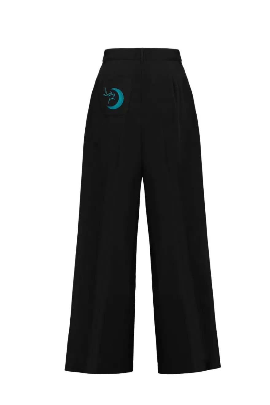 Black wide leg swing trousers Tailored like fabric Large teal snake embroidery on front of one legDetachable silver char…