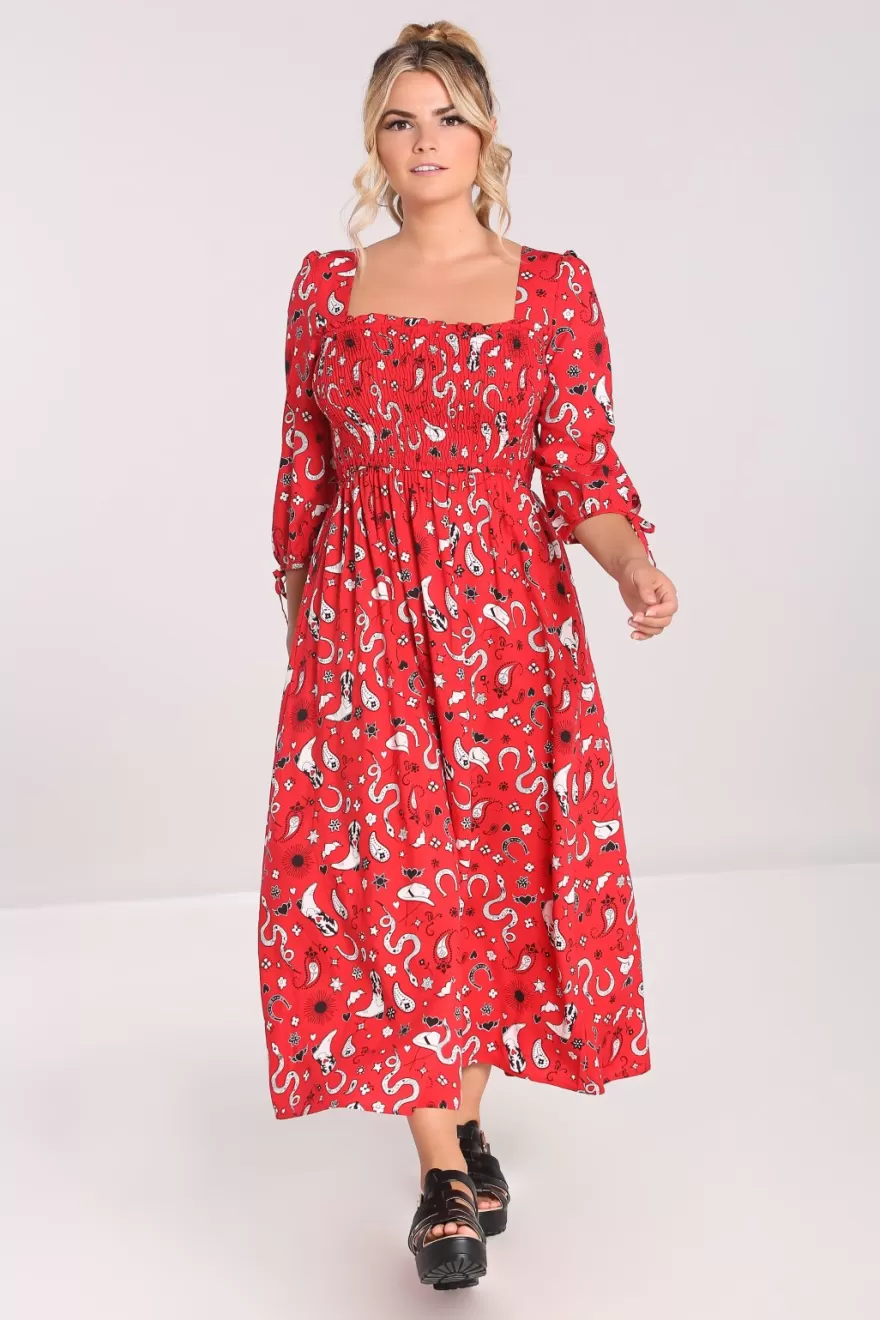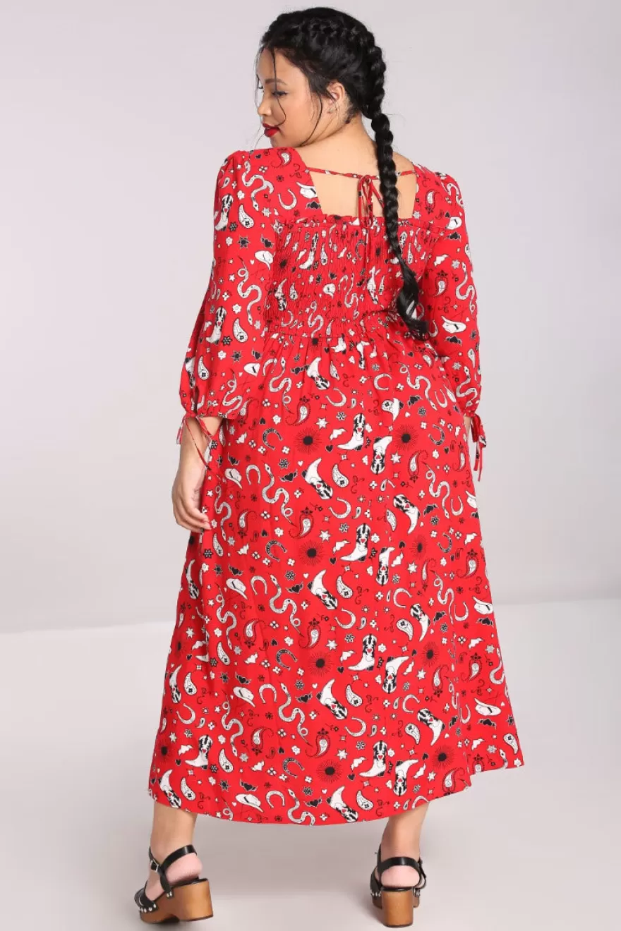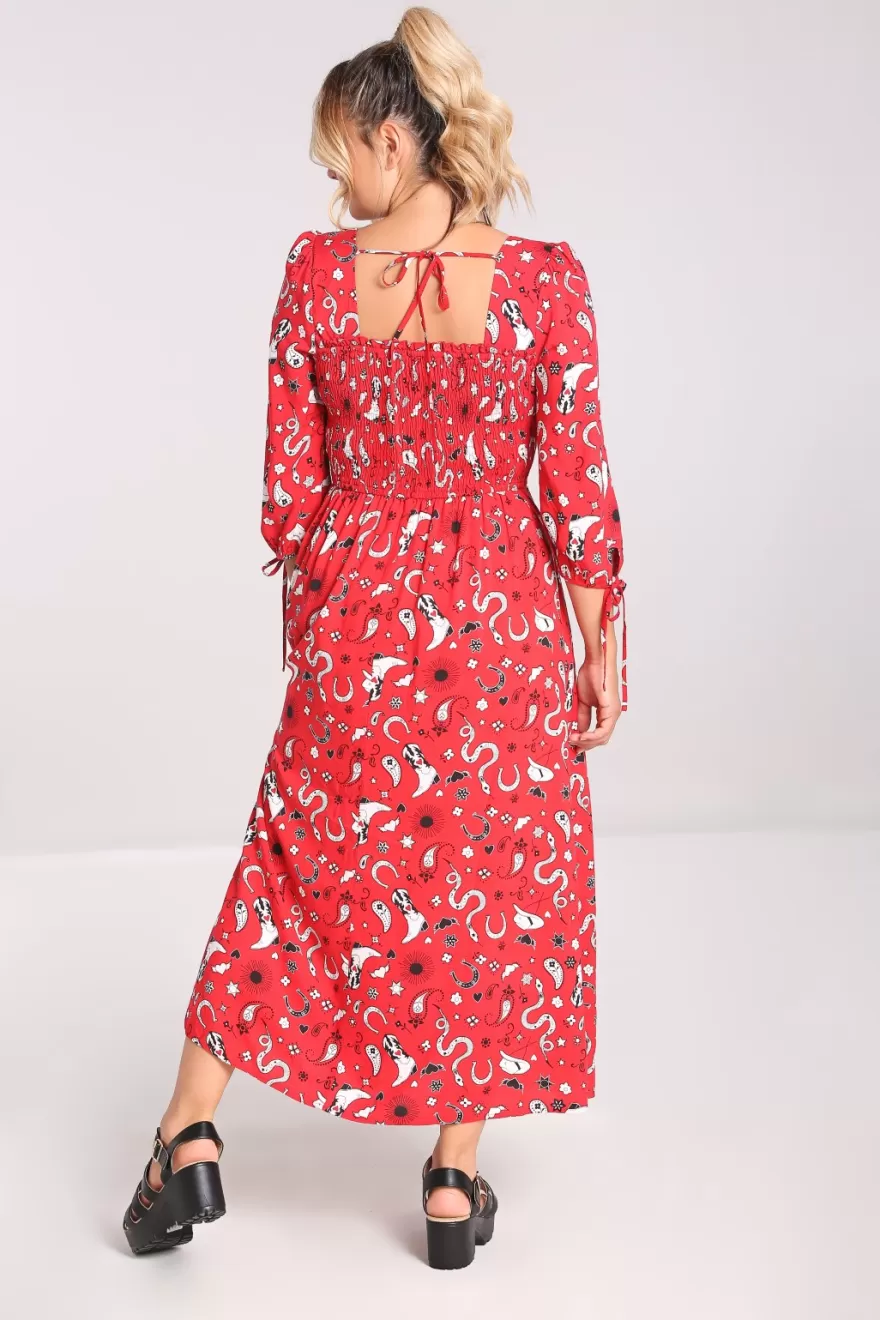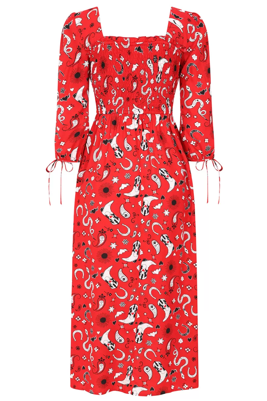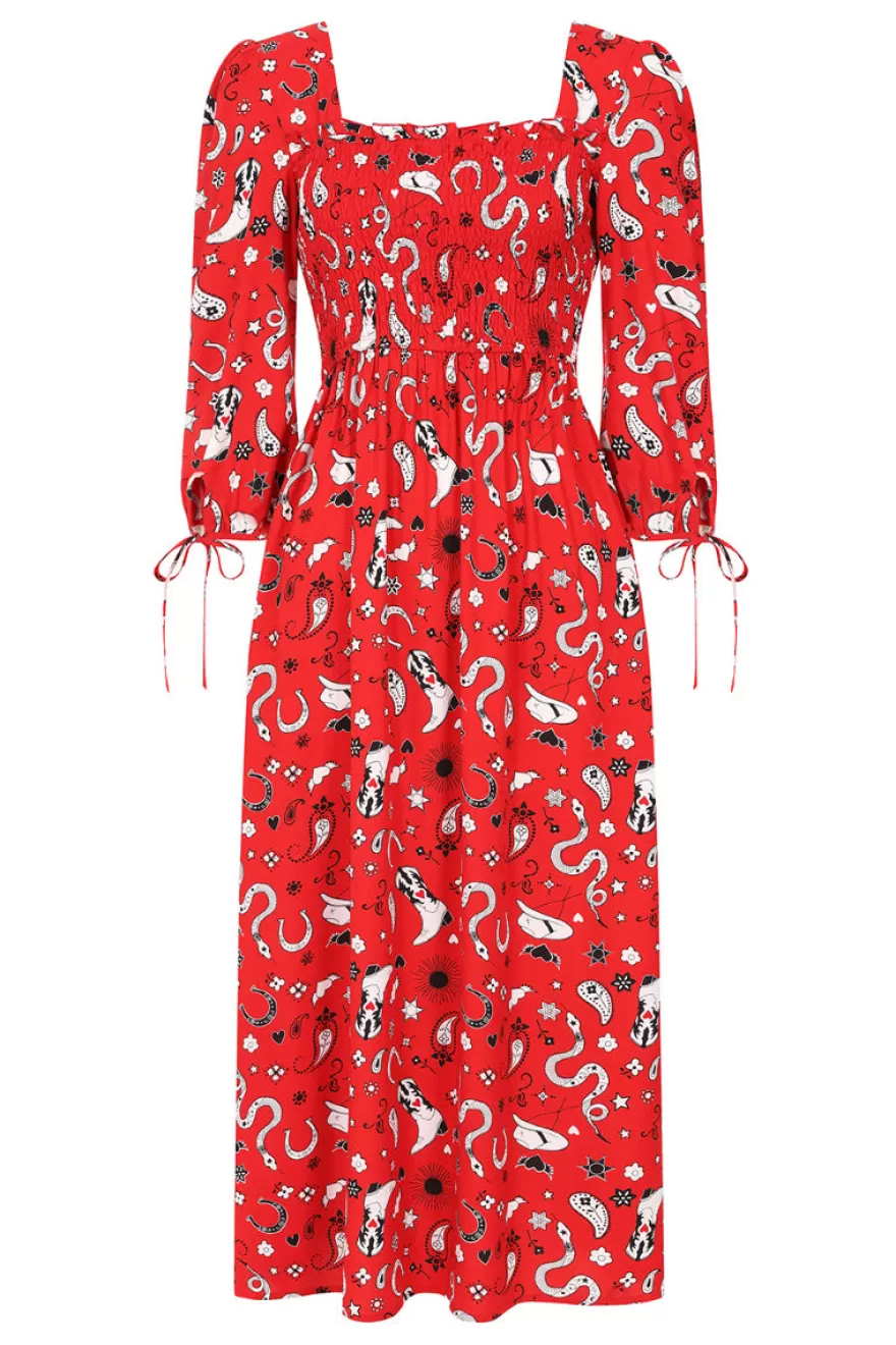 Printed viscose maxi dressRed base fabric with cowboy hats, boots, snakes & various motifs in white Square neckline Bodi…