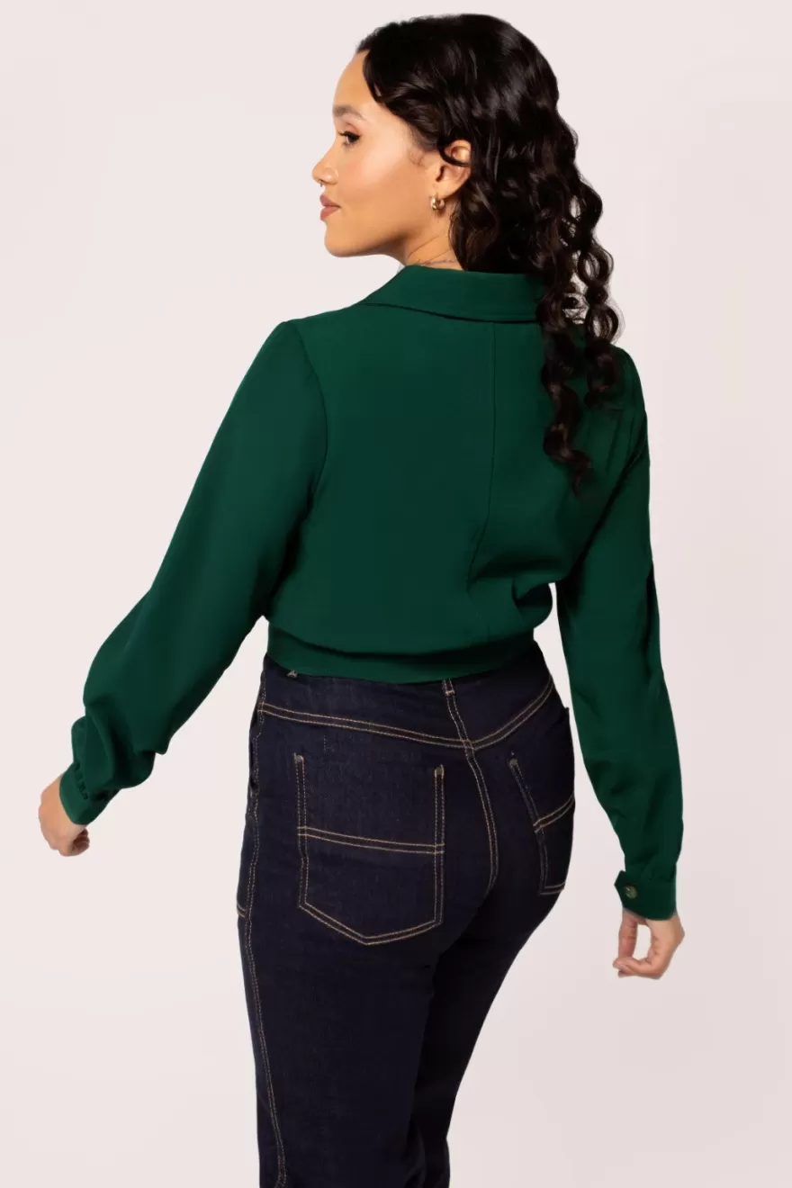 - Framed by a flattering v-neckline, pointed collar and full length, slightly puffed sleeves with button detailing on cuffs