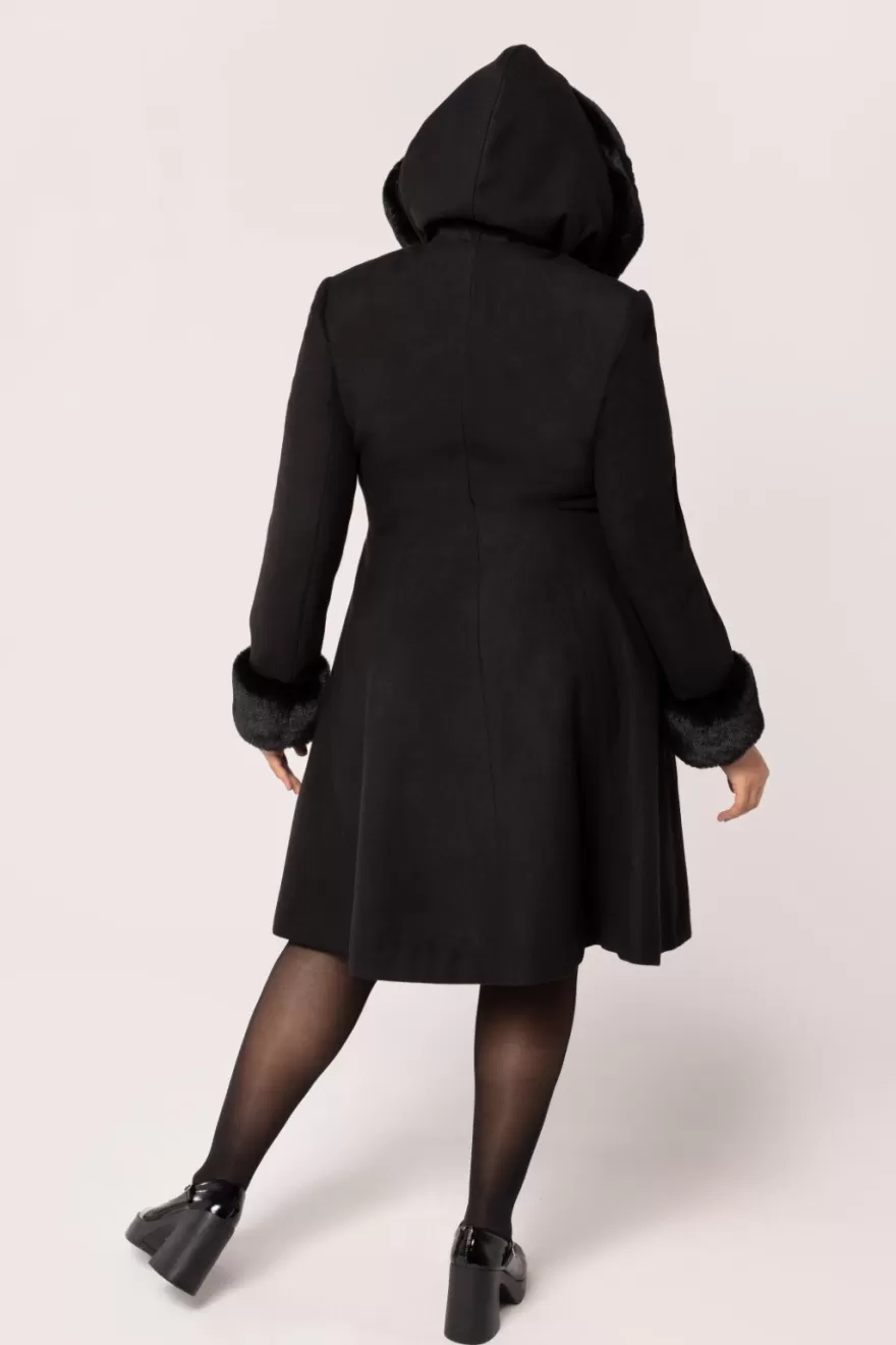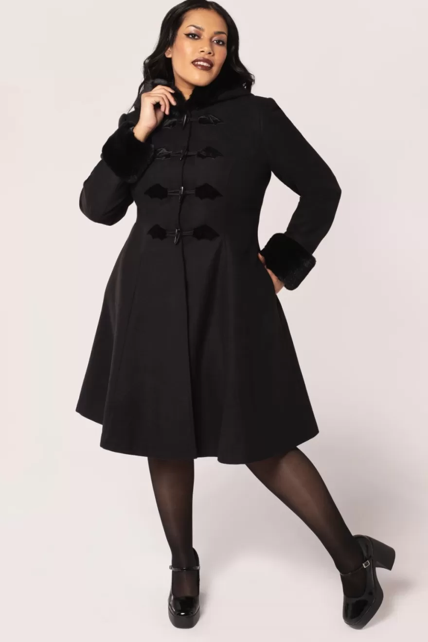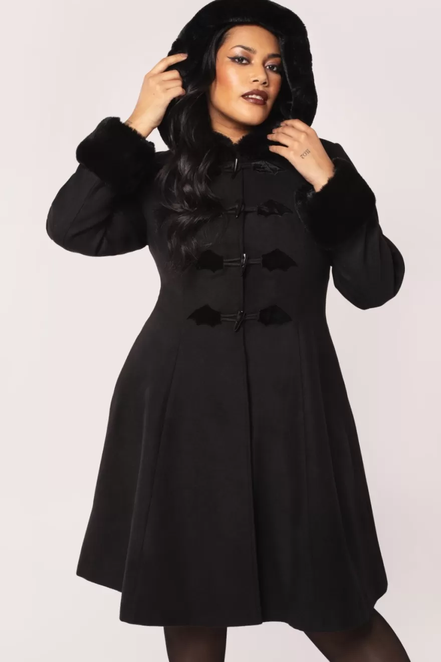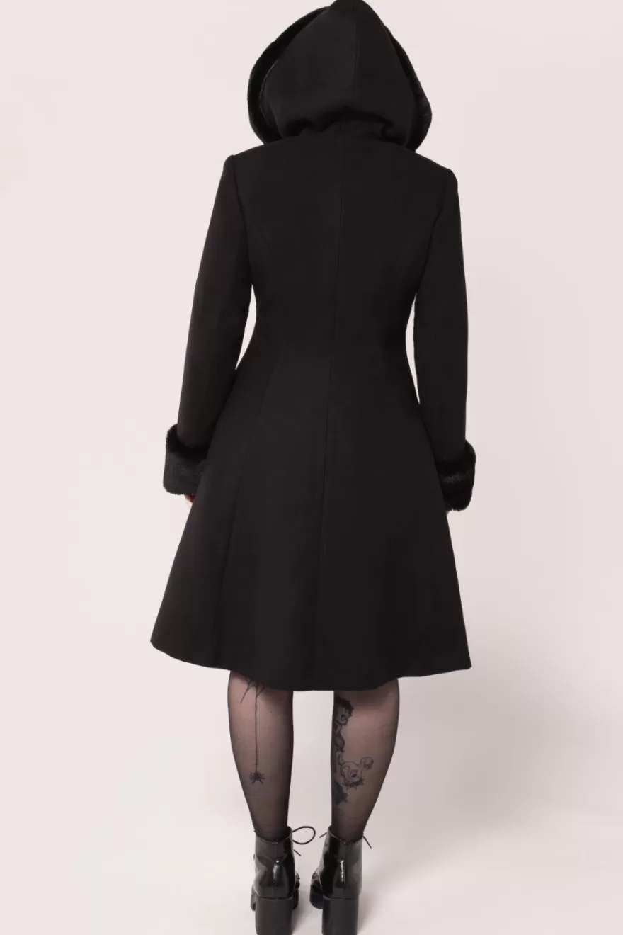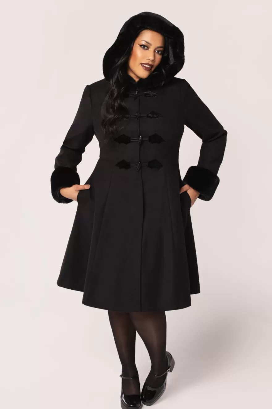 Black fitted coatHood & sleeves with soft faux fur trim Black toggle fastening on centre front Black velvet applique bat…