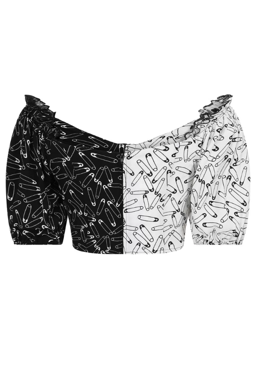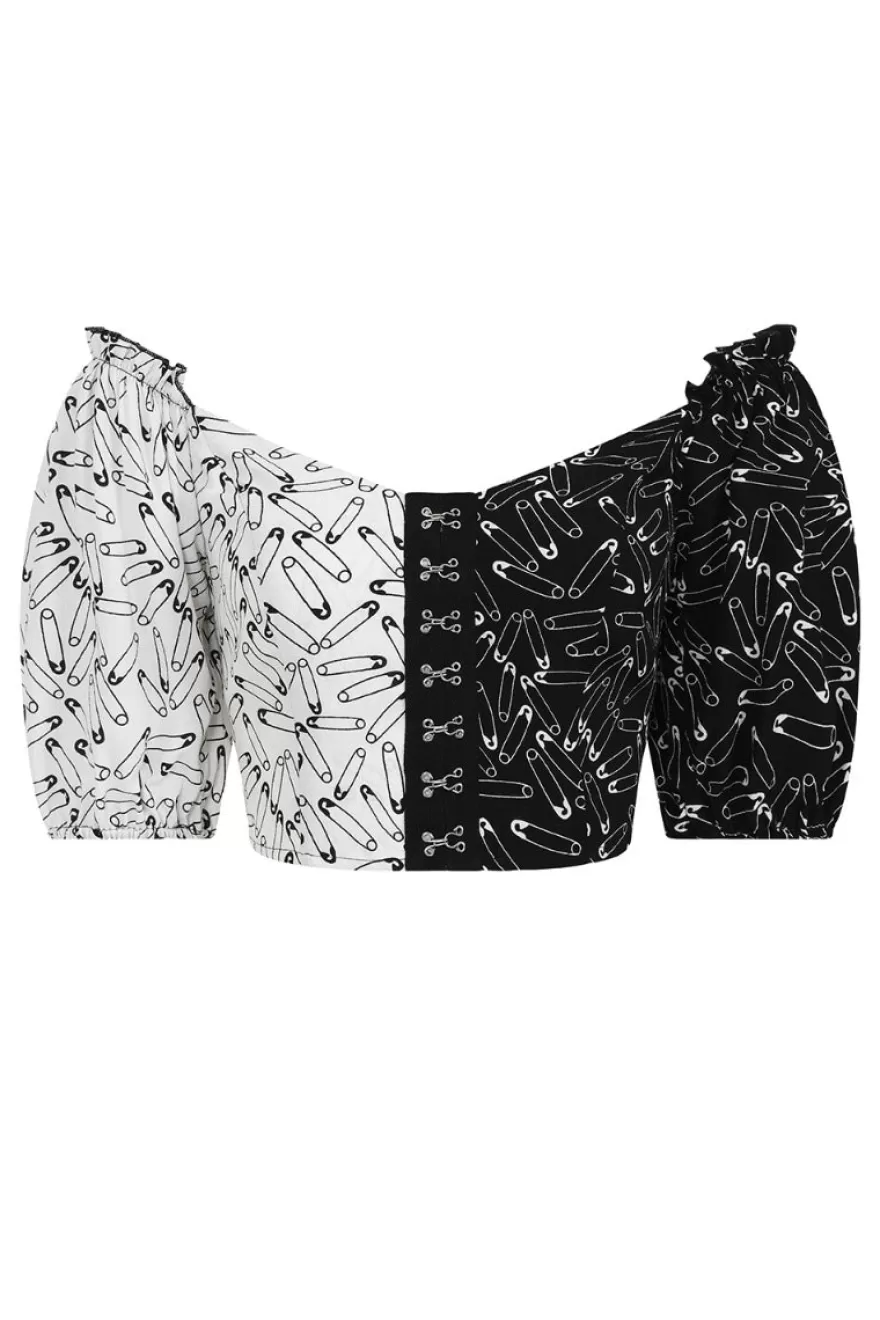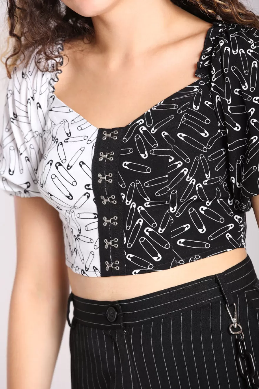Printed crop topHalf black & half white fabric with contrasting safety pin graphicsPuff sleeves with elasticated cuff, c…