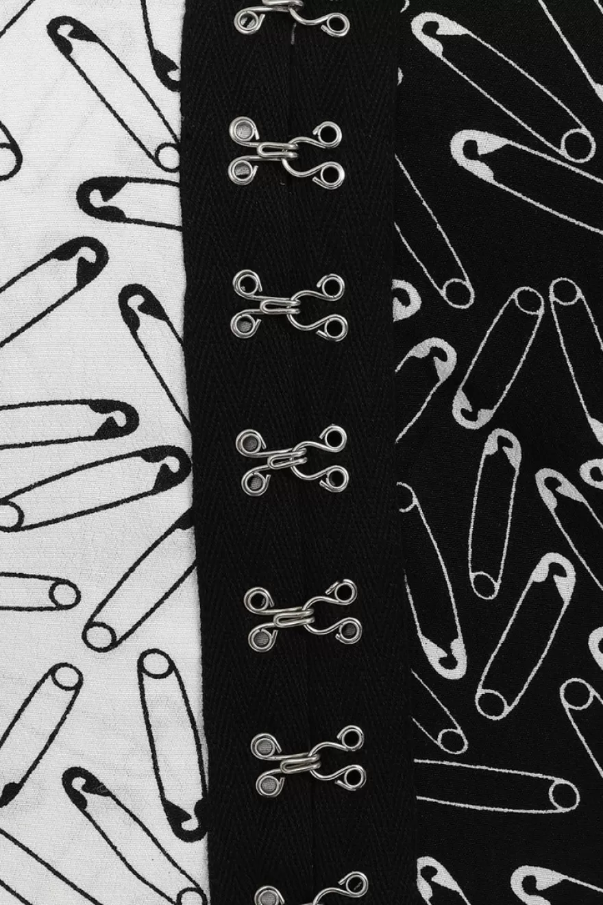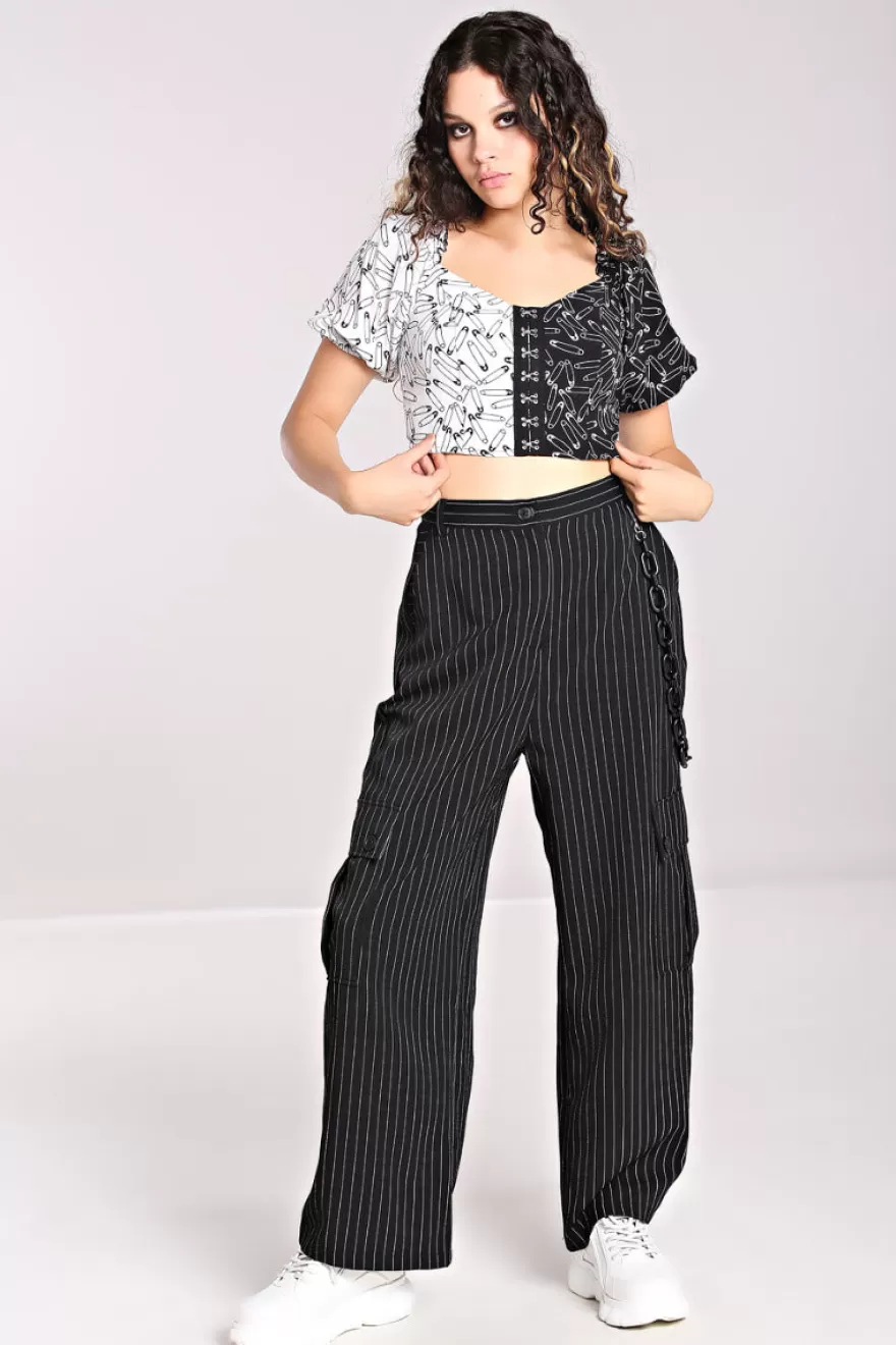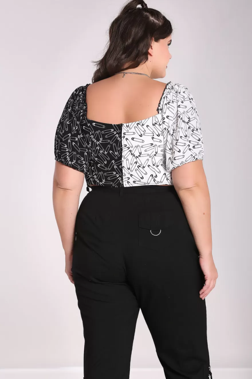 Printed crop topHalf black & half white fabric with contrasting safety pin graphicsPuff sleeves with elasticated cuff, c…