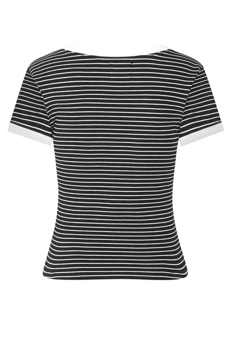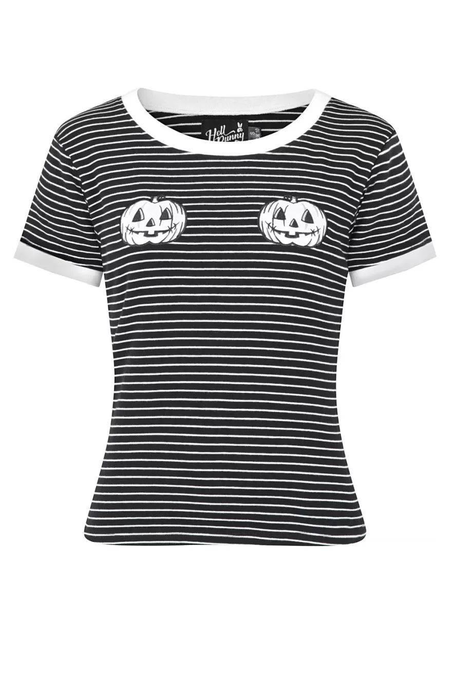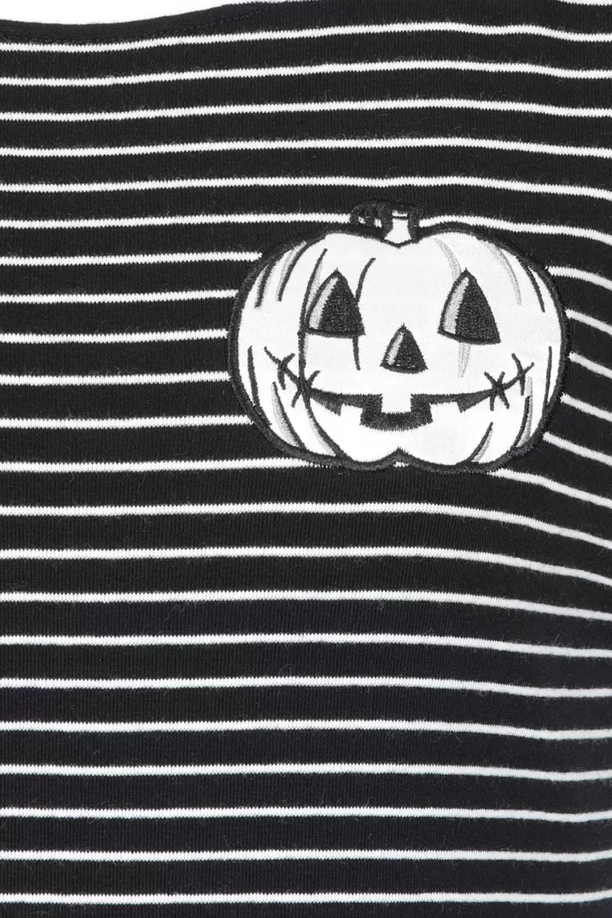 Striped black & white stretchy topContrasting cuffs and neckline in whiteScooped necklineShort sleevesWhite jack o lante…